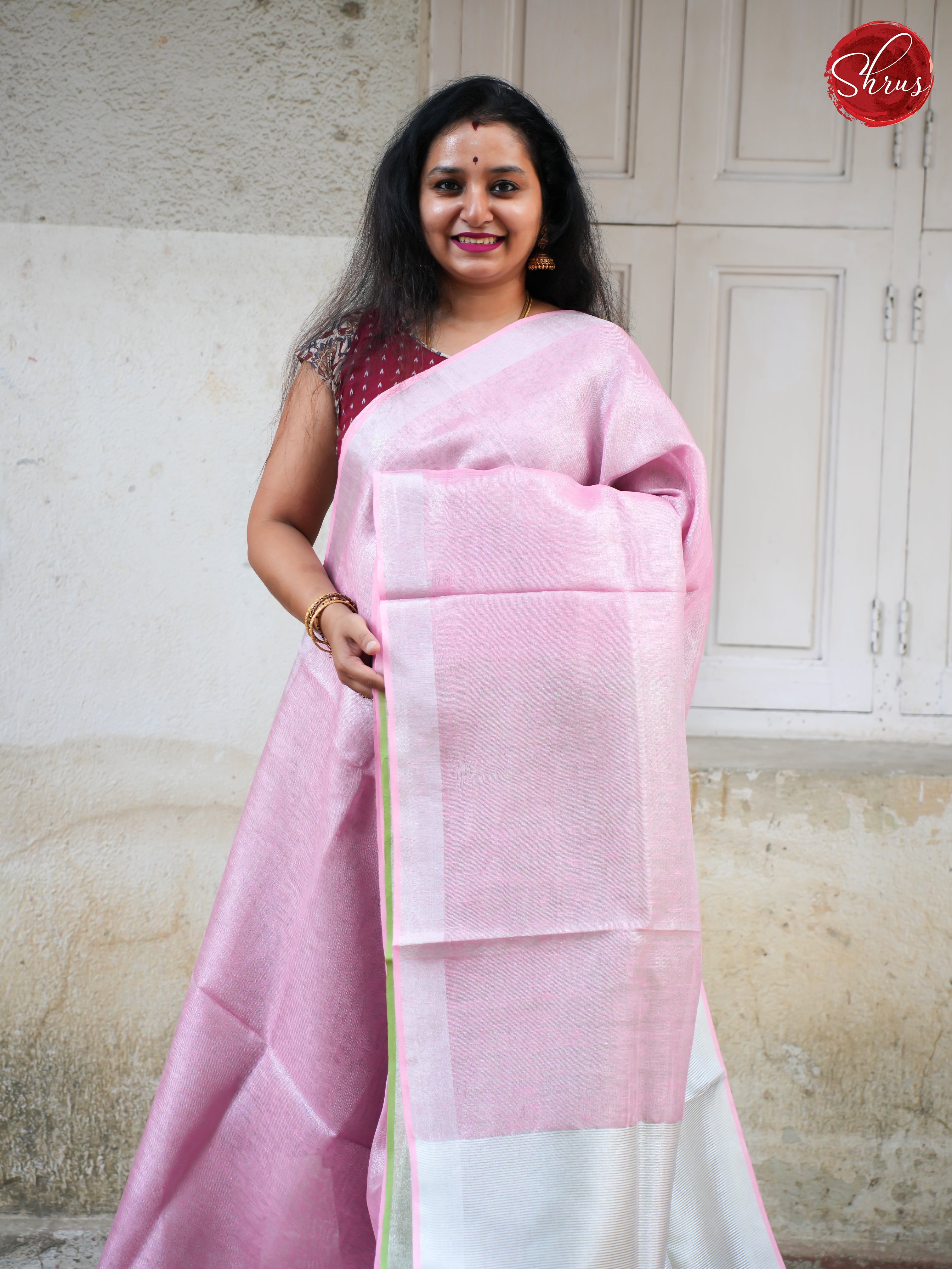 Elegant Pink Linen saree with plain body that adds charm. The self zari border and pallu add to its beauty. It comes with a Green plain blouse with a border to perfectly complement the design.