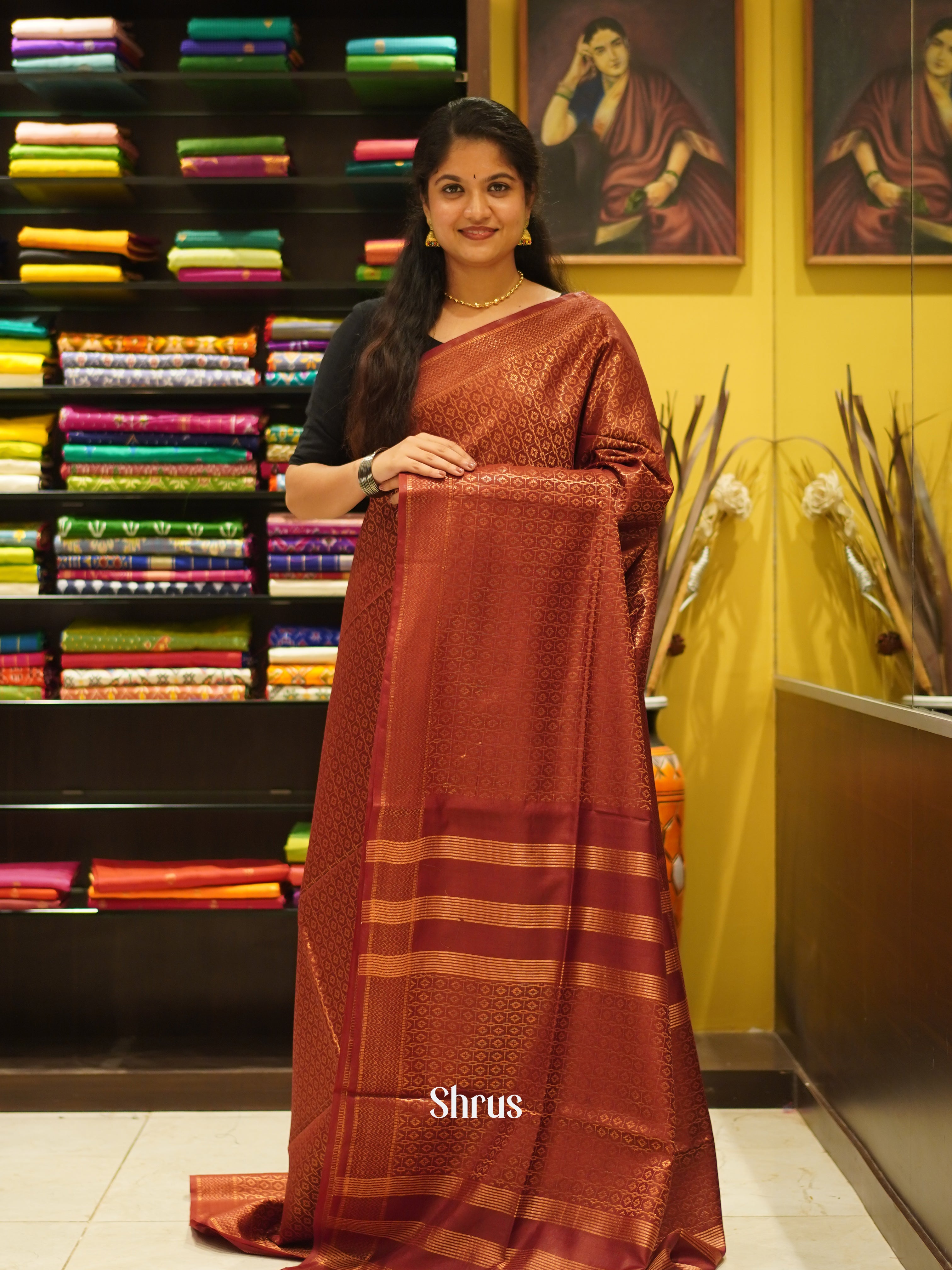 Classy Maroon Semi Tussar Saree boasts a zari brocade design and Zari Border, elevating its appearance. The self zari striped Pallu adds sophistication, while the plain self blouse with zari border gives a contemporary touch to the ensemble.