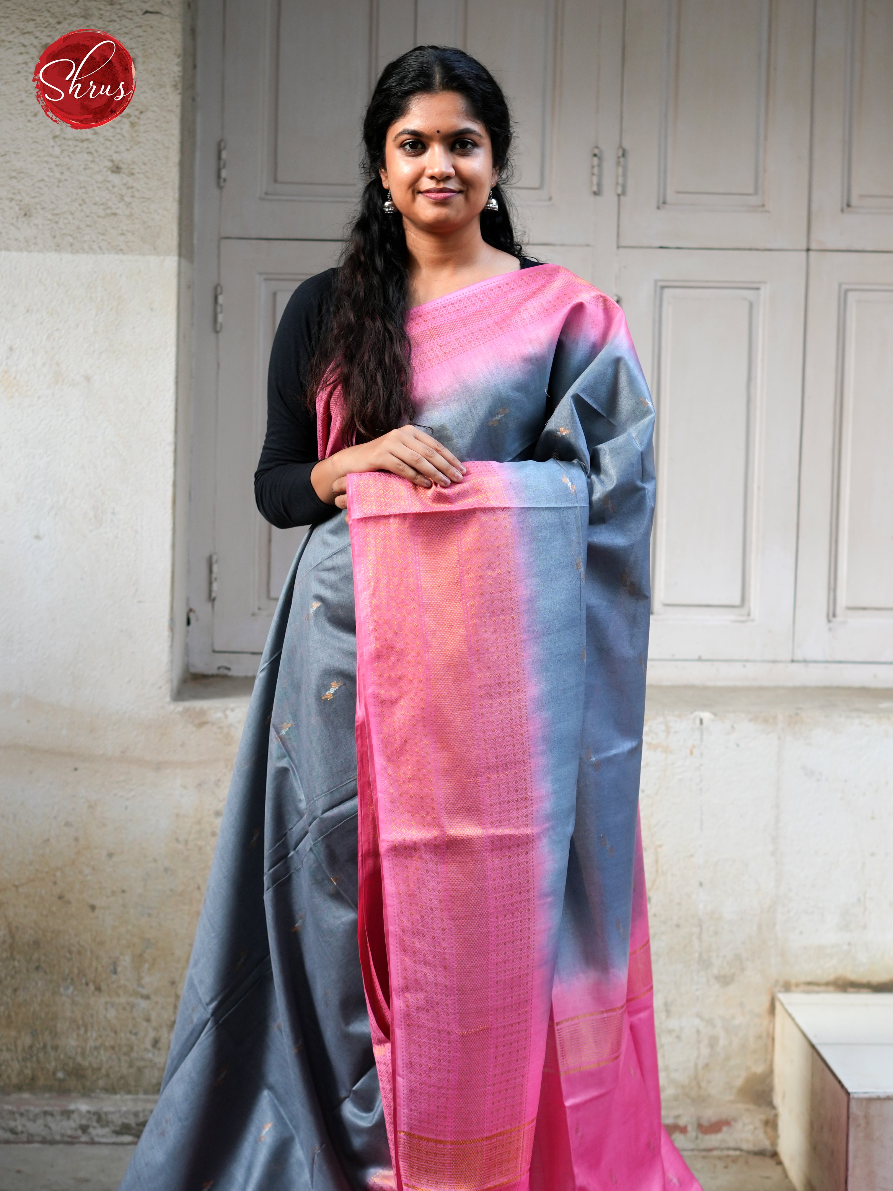 Pretty Grey Semi Tussar saree features beautiful zari buttas on the body and Pink zari border. The traditional saree is completed with a contrasting Pink zari-woven pallu and a plain blouse with a border.