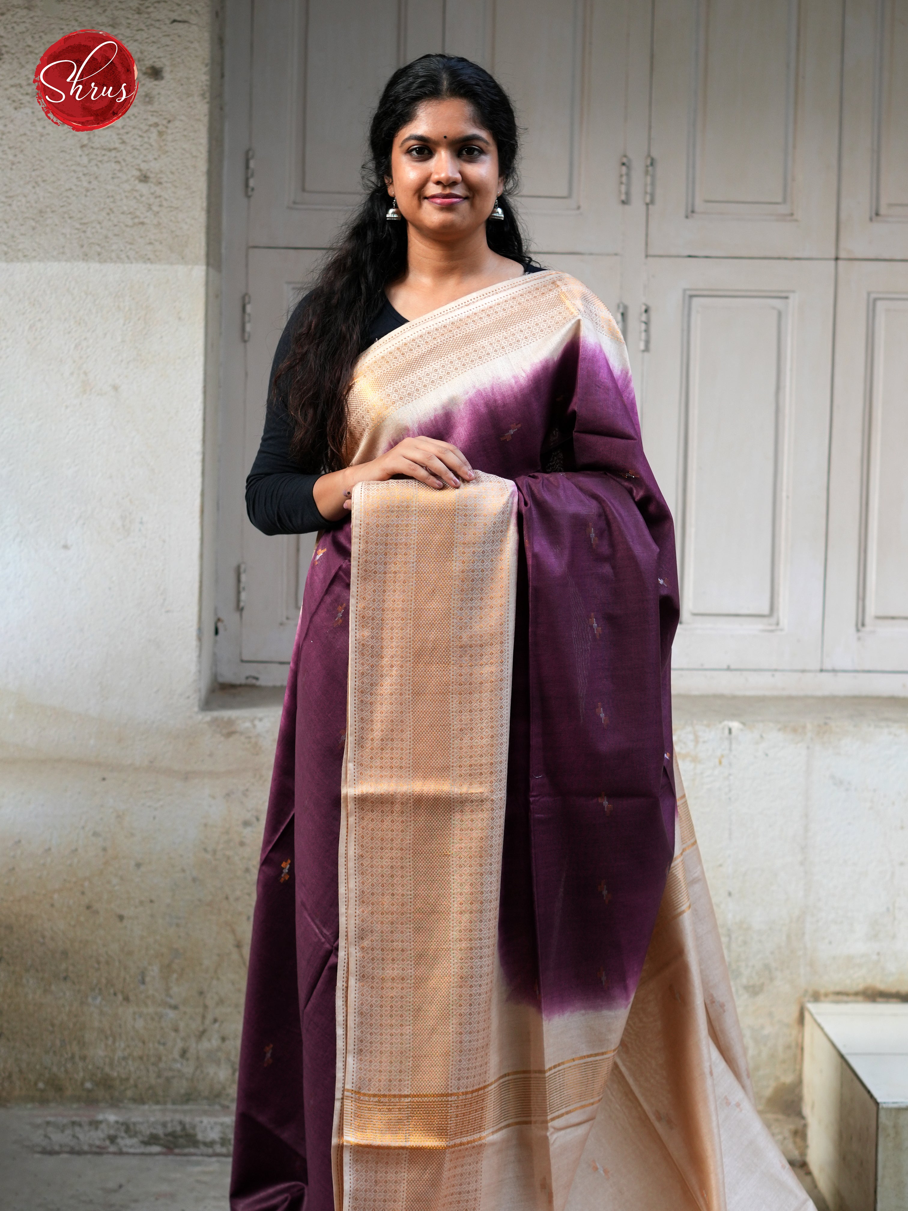 Elegant Deep Wine Semi Tussar saree features beautiful zari buttas on the body and Cream zari border. The traditional saree is completed with a contrasting Cream zari-woven pallu and a plain blouse with a border.
