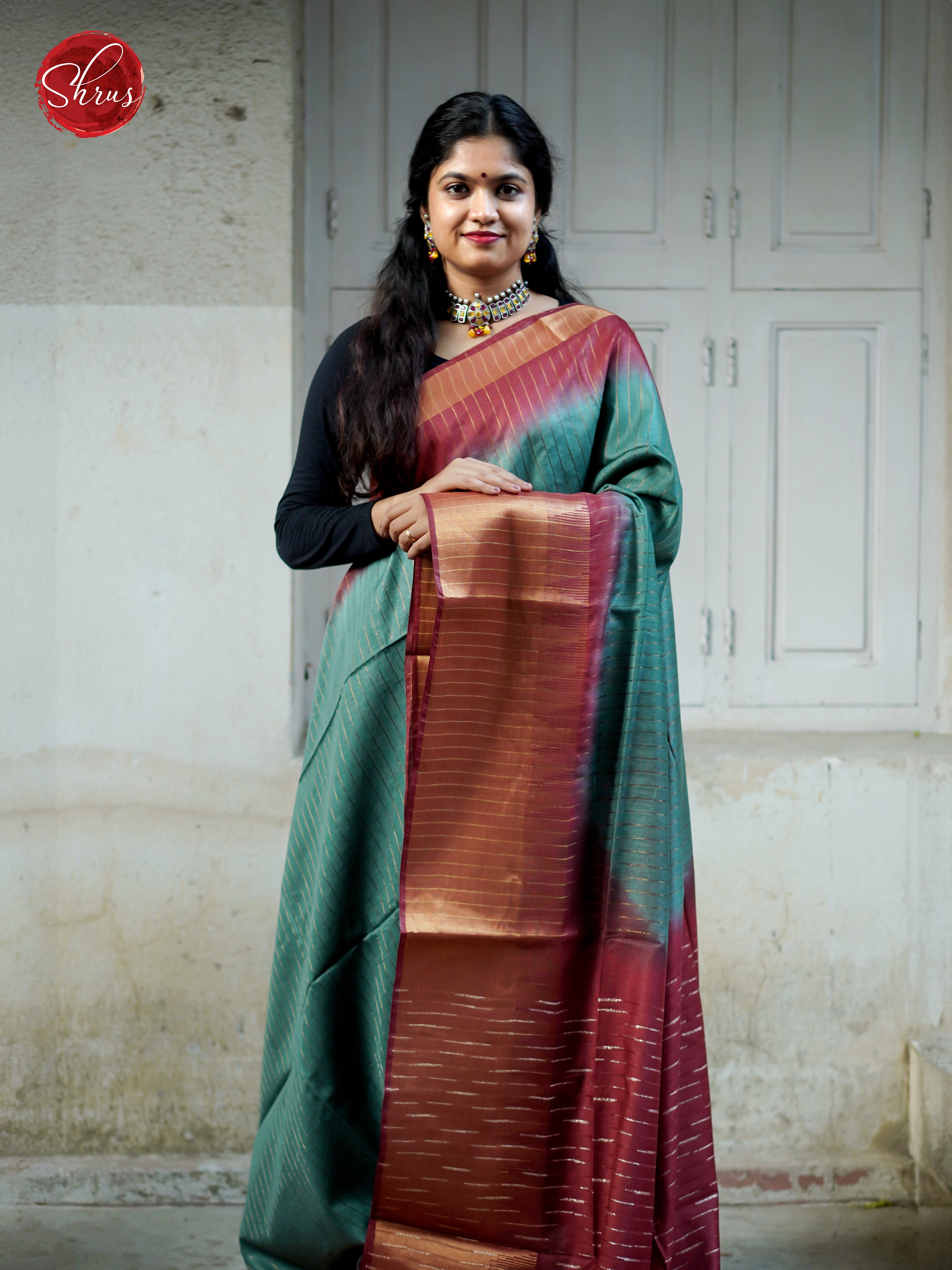Elegant Green Semi Tussar saree showcases intricate zari checks on the body and a beautiful Contrast Maroon zari border. The saree is paired with a traditional pallu woven in Maroon zari and a plain blouse with a border.