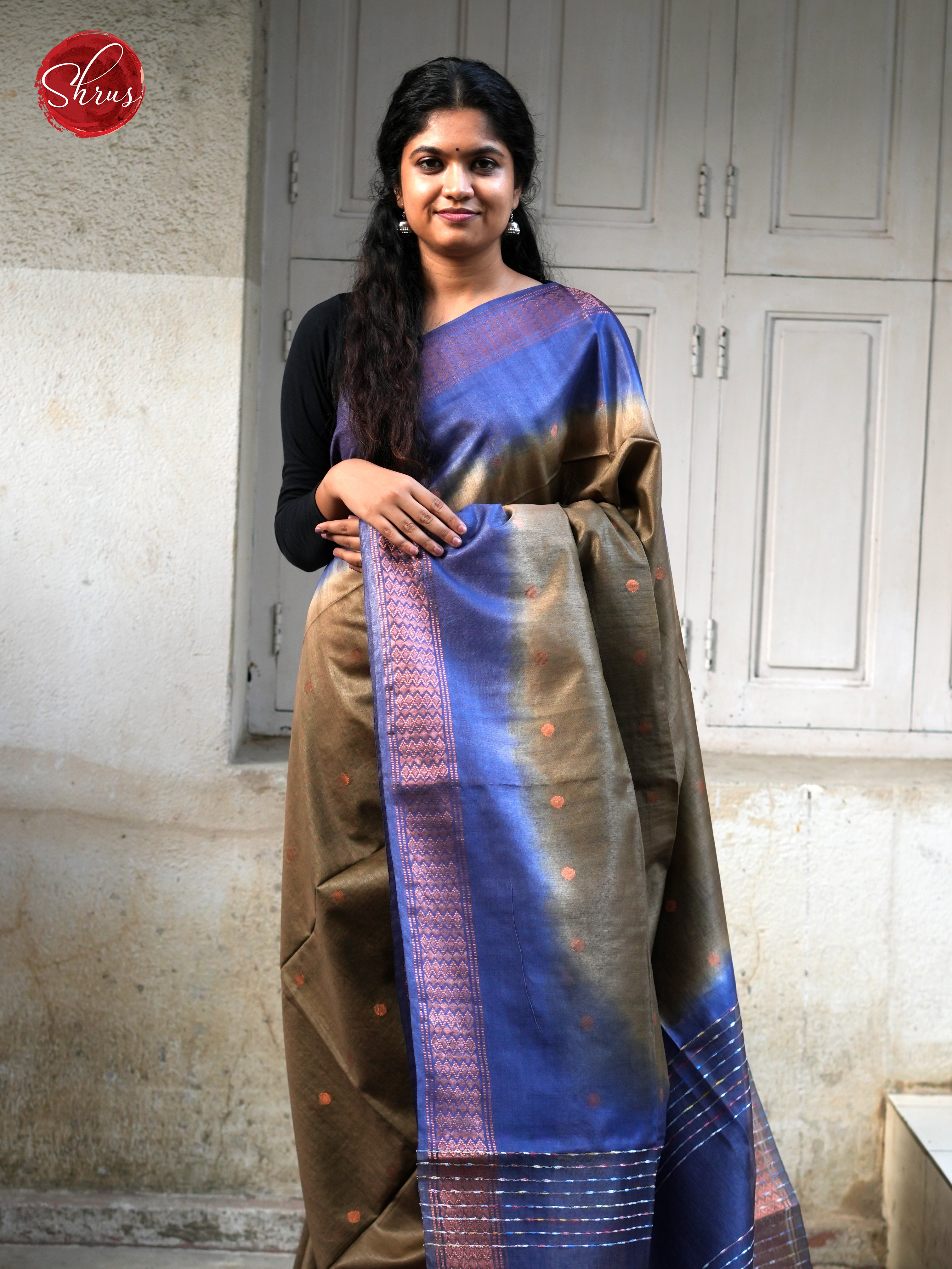 Elegant Grey Semi Tussar saree showcases intricate zari buttas on the body and a beautiful Contrast Blue zari border. The saree is paired with a traditional pallu woven in Blue zari and a plain blouse with a border.