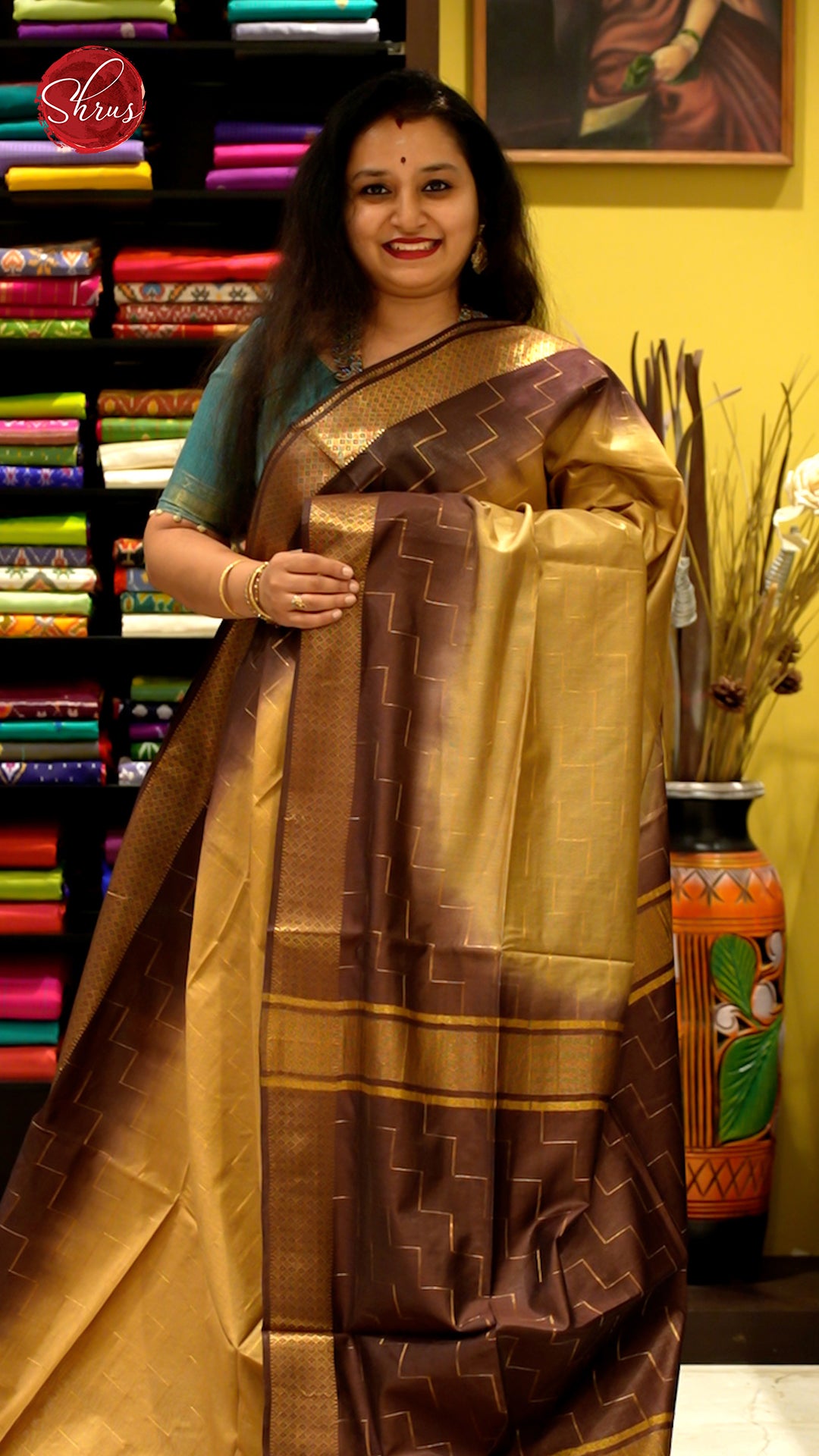 Elegant Beige Semi Tussar saree features beautiful zari wavy stripes on the body and contrast Brown zari border. The traditional saree is completed with a contrasting Brown zari-woven pallu and a plain blouse with a border.