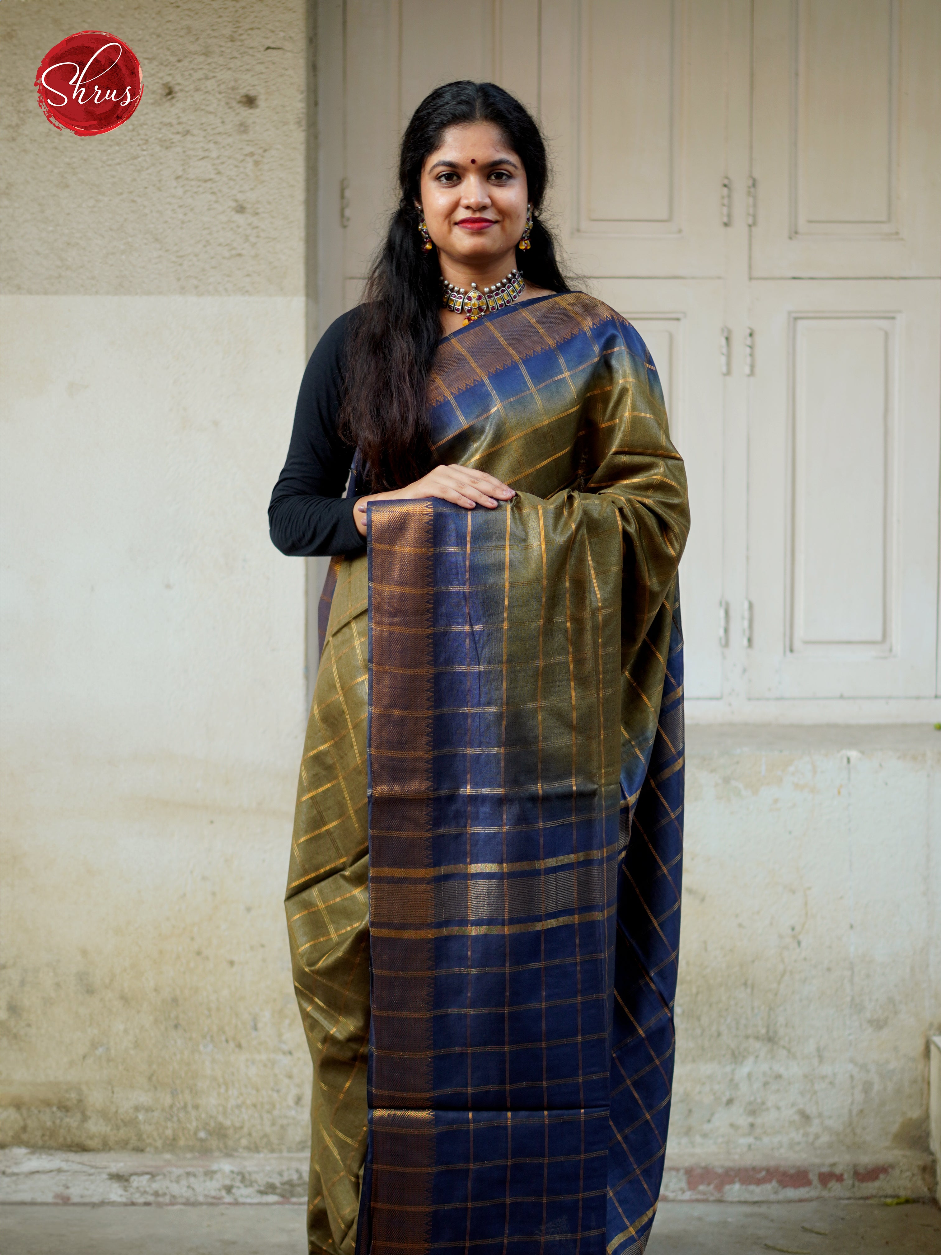 Pretty Green Semi Tussar saree showcases intricate zari striped on the body and a beautiful Contrast Blue zari border. The saree is paired with a traditional pallu woven in Blue zari and a zari striped blouse with a border.