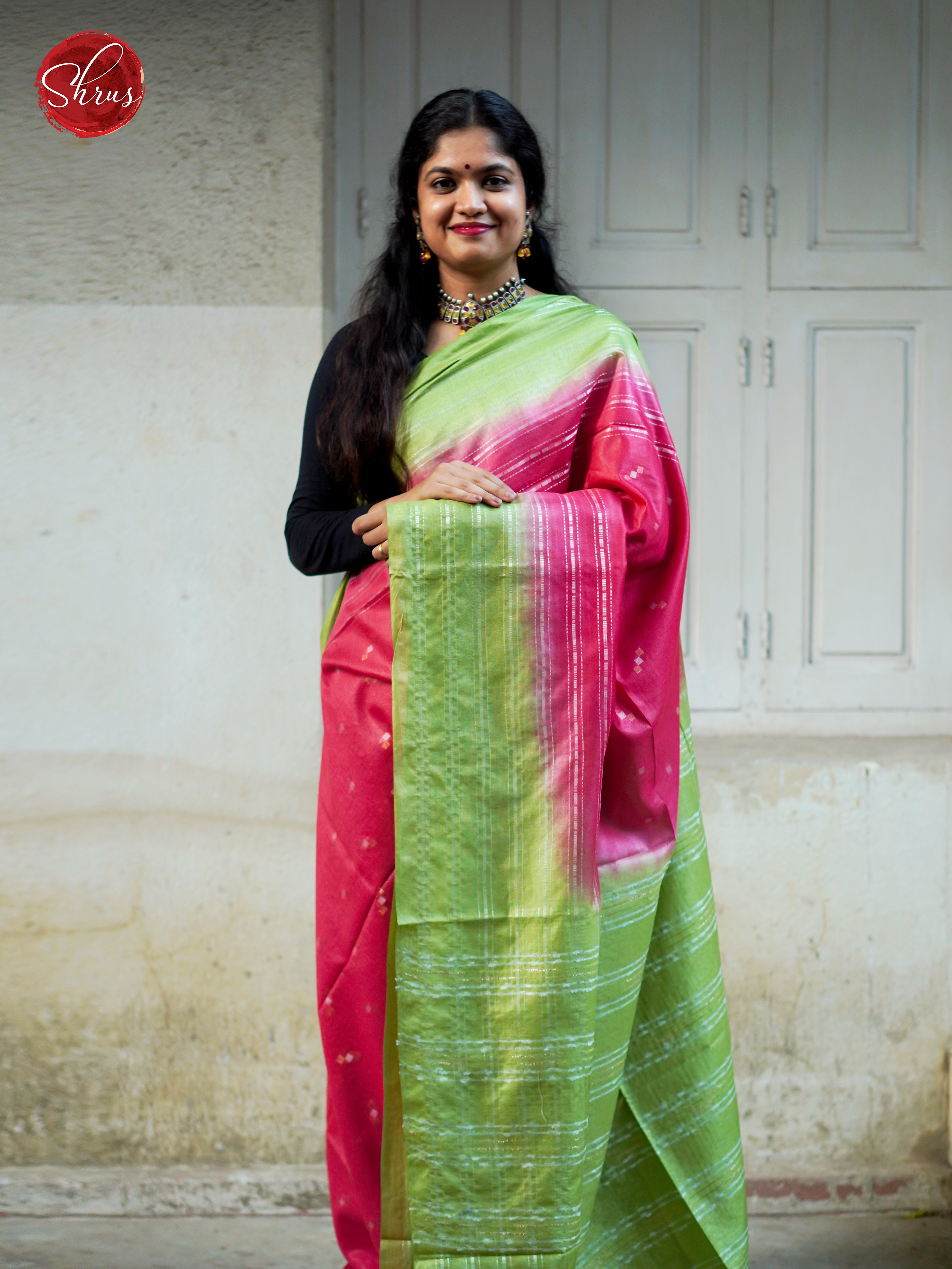 Stunning Reddish Pink Semi Tussar saree showcases intricate zari stripes on the body and a beautiful Contrast Green zari border. The saree is paired with a traditional pallu woven in green zari and a plain blouse with a border.