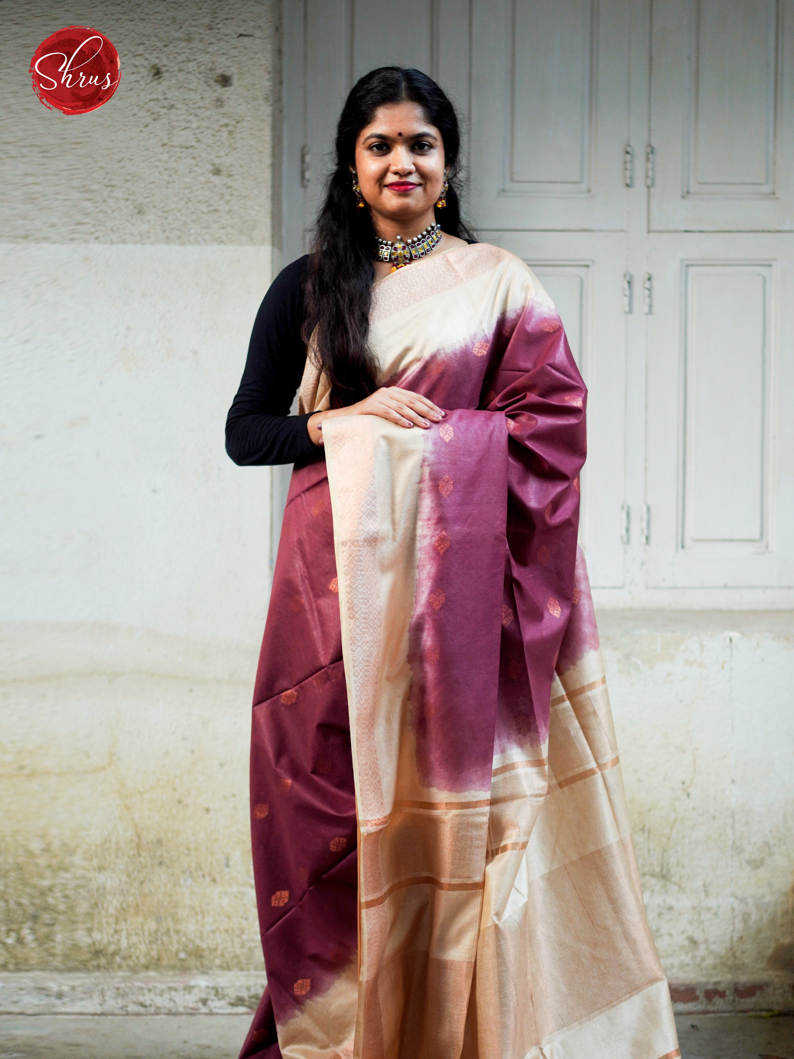 Very Pretty Purple Semi Tussar saree features zari buttas on the body and Contrast Cream zari border. The traditional saree is completed with a contrasting Cream zari-woven pallu and a plain blouse with a border.
