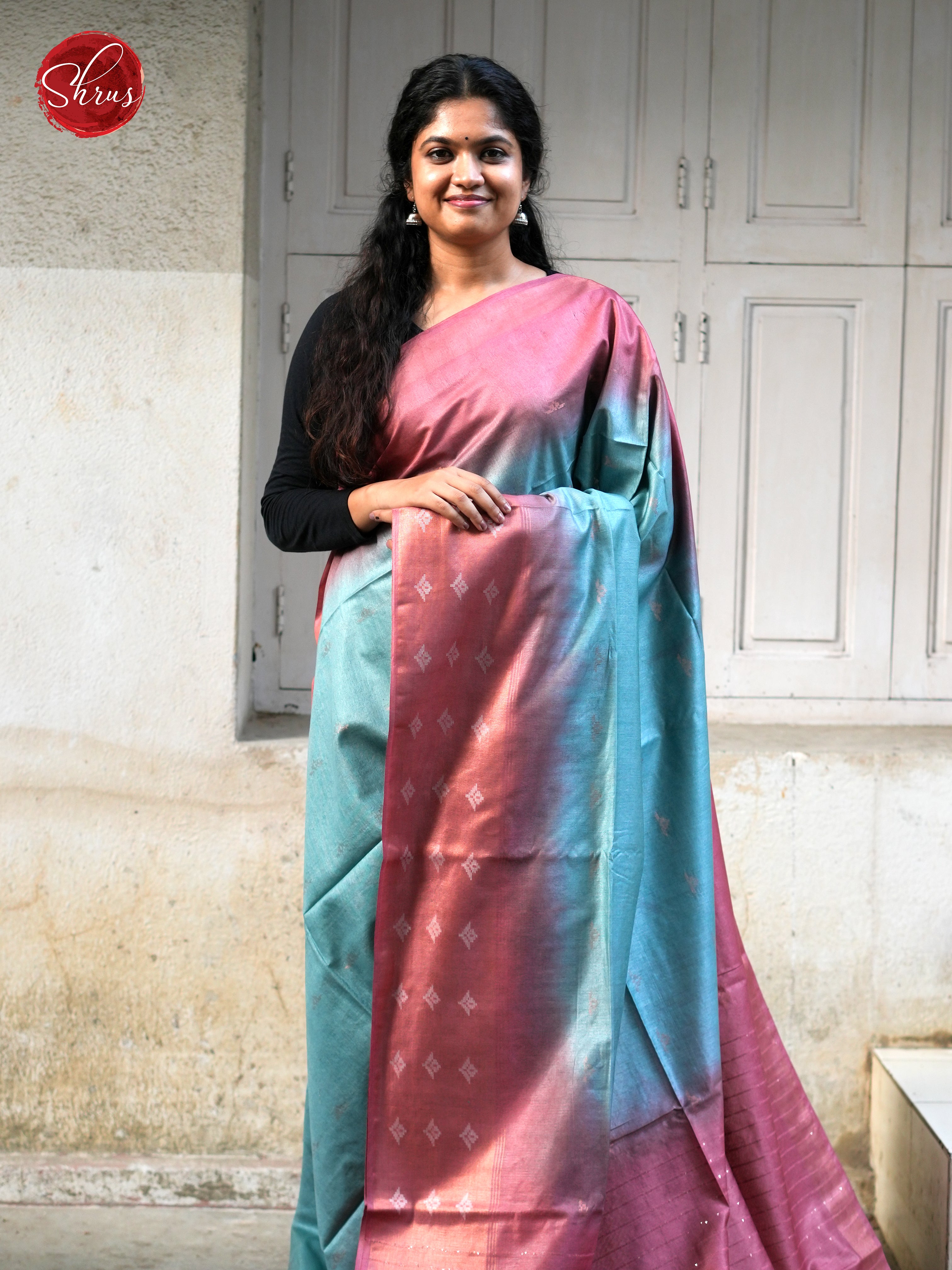 Elegant Blue Semi Tussar saree features beautiful zari buttas on the body and Onion Pink zari border. The traditional saree is completed with a contrasting Onion Pink zari-woven pallu and a plain blouse with a border.