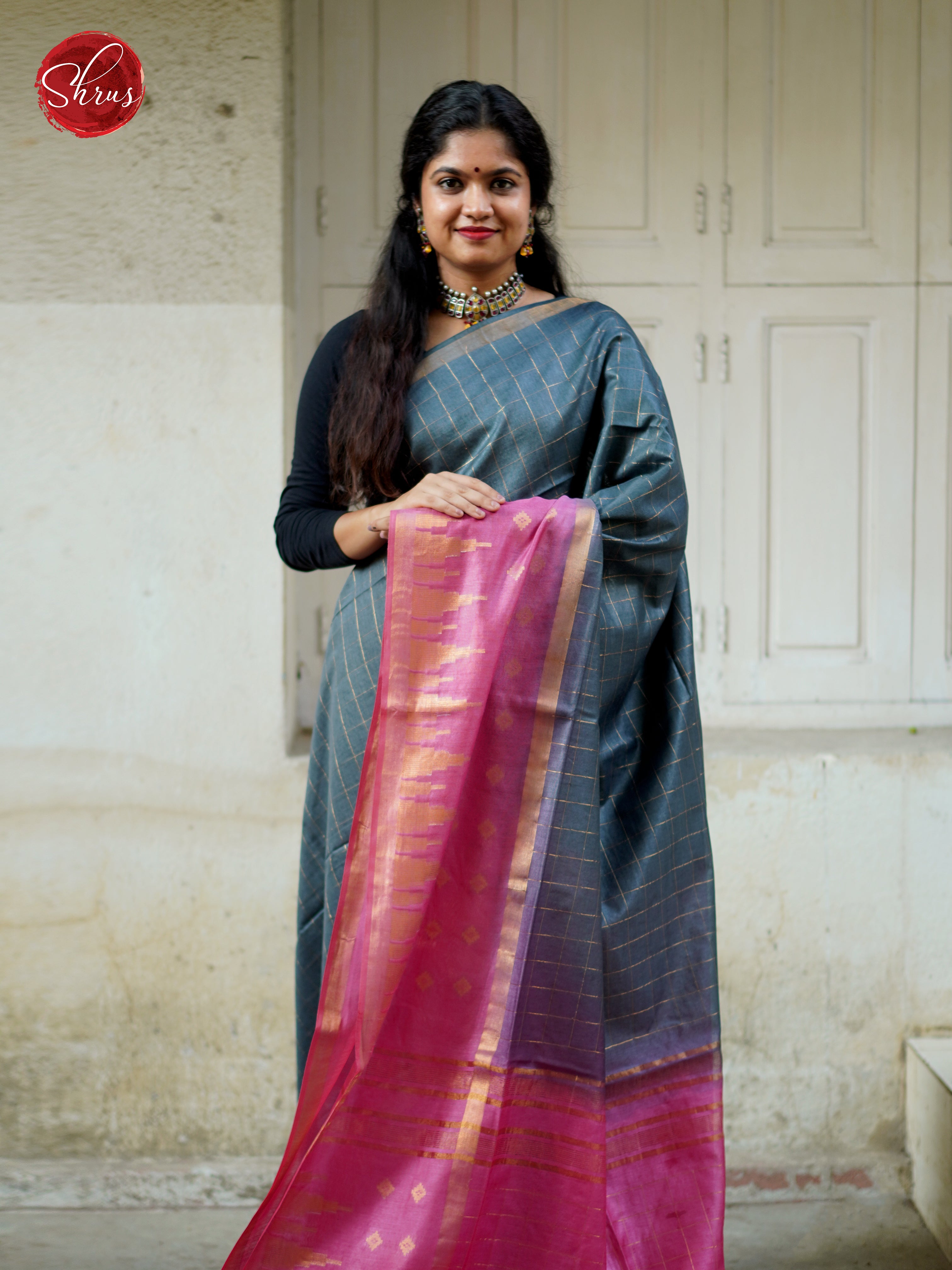 Elegant Grey Semi Tussar saree features beautiful zari checks on the body and Pink zari border. The traditional saree is completed with a contrasting Pink zari-woven pallu and a plain blouse with a border.