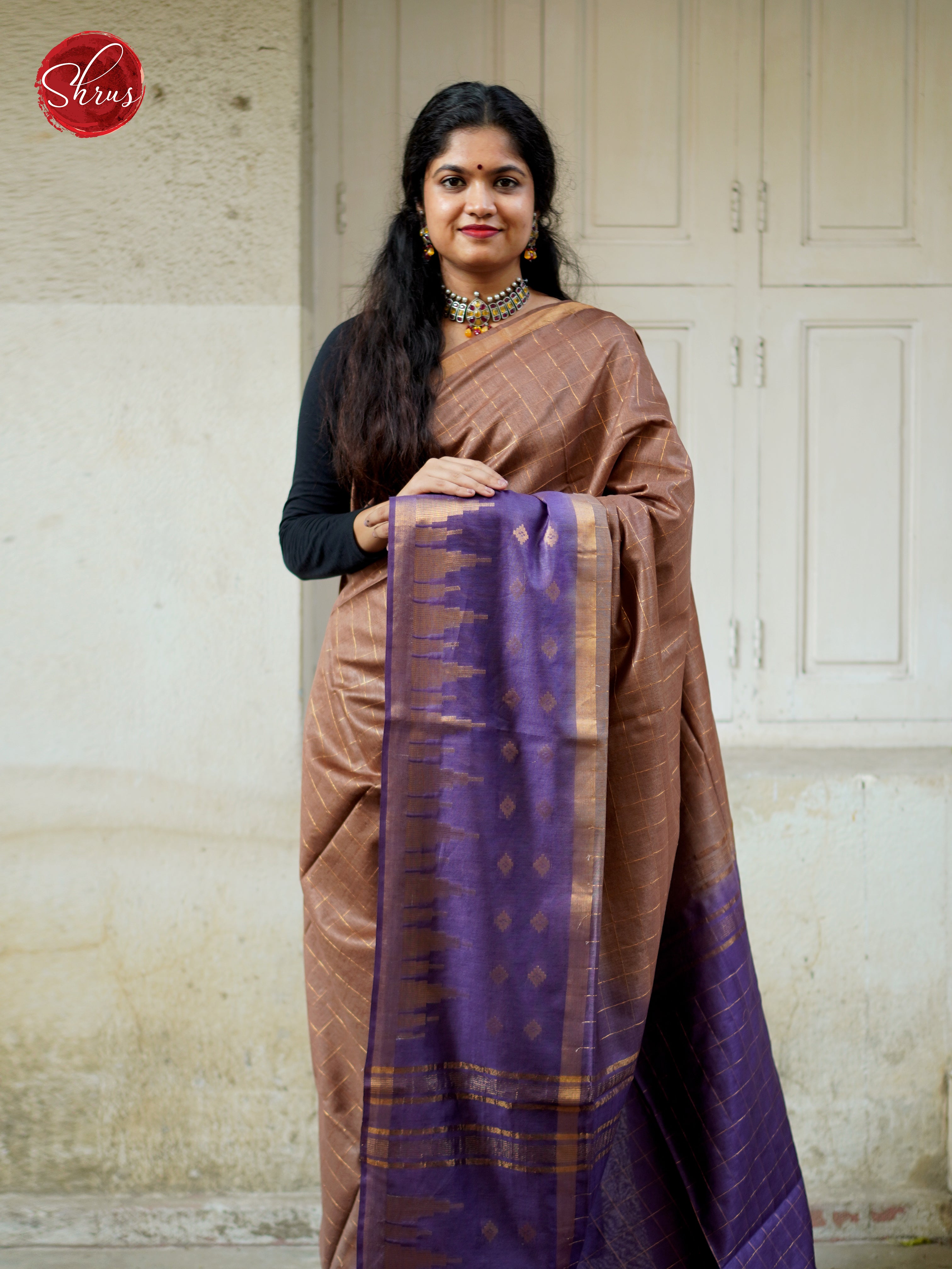 Elegant Brown Semi Tussar saree features beautiful zari buttas on the body and purple zari border. The traditional saree is completed with a contrasting purple zari-woven pallu and a plain blouse with a border.