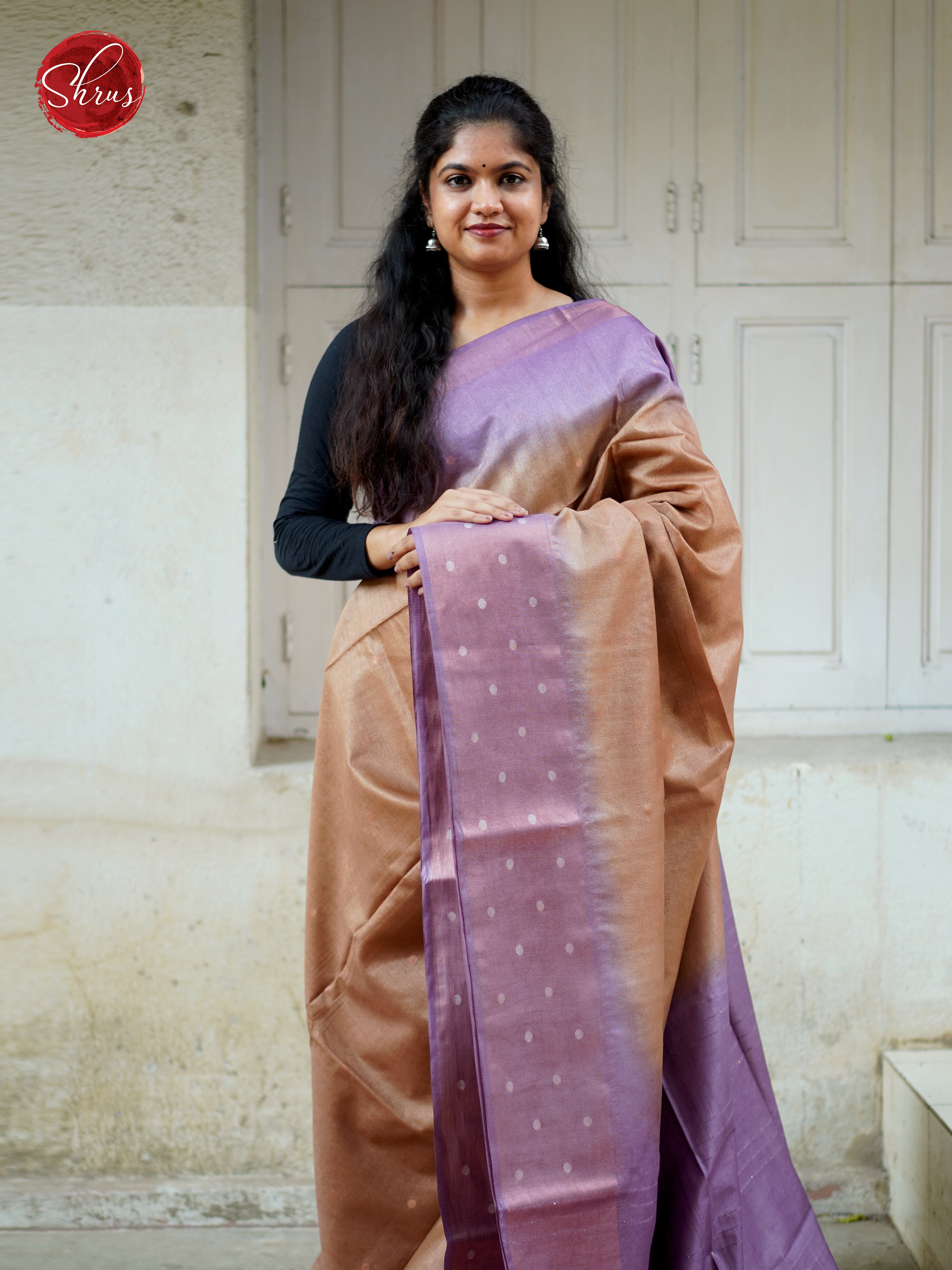 Very Pretty Brown Semi Tussar saree features beautiful zari buttas on the body and purple zari border. The traditional saree is completed with a contrasting purple zari-woven pallu and a plain blouse with a border.