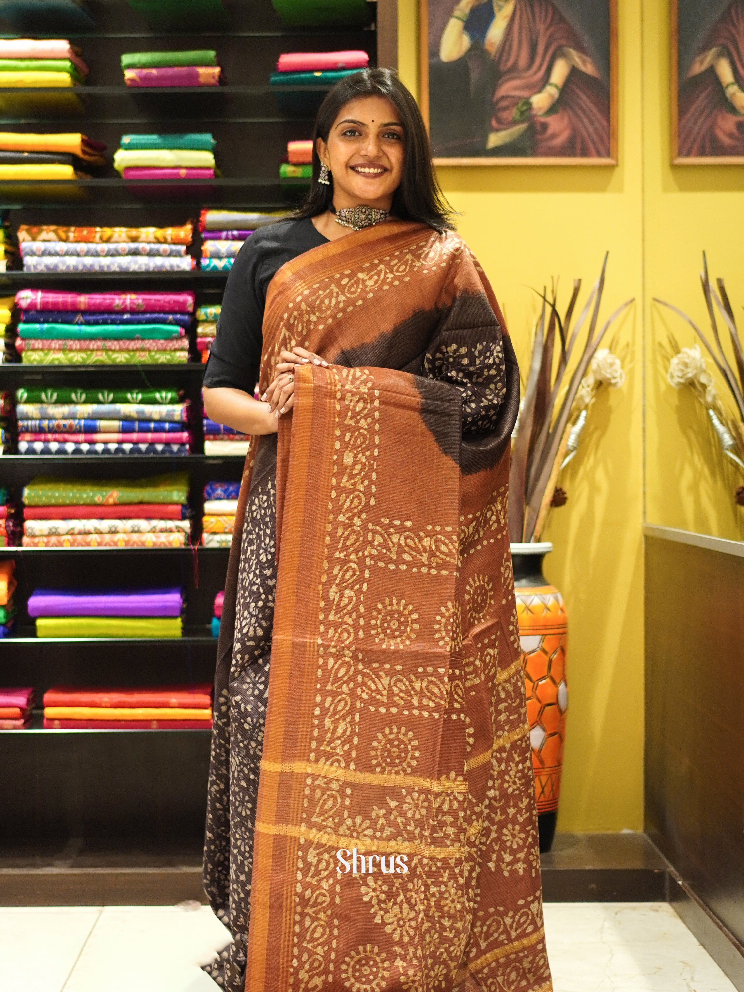 Very Pretty Dark Brown Bhatik saree boasts a stunning floral pattern , Zari Stripes on the body and a contrast Brown printed, Zari border. The contrast pallu adds a touch of glamour. Complete with a matching contrast blouse, this saree is the perfect choice for a polished look.