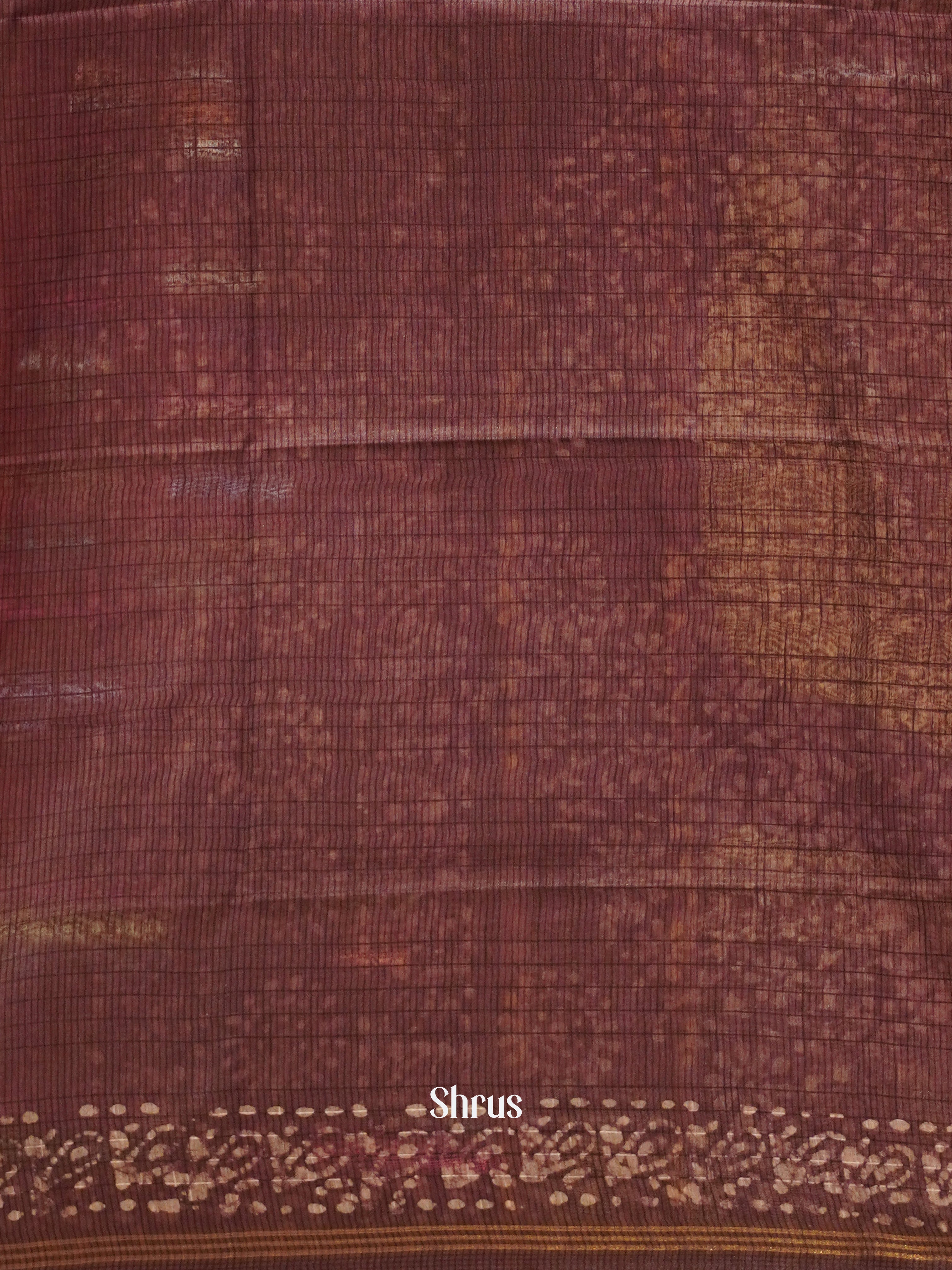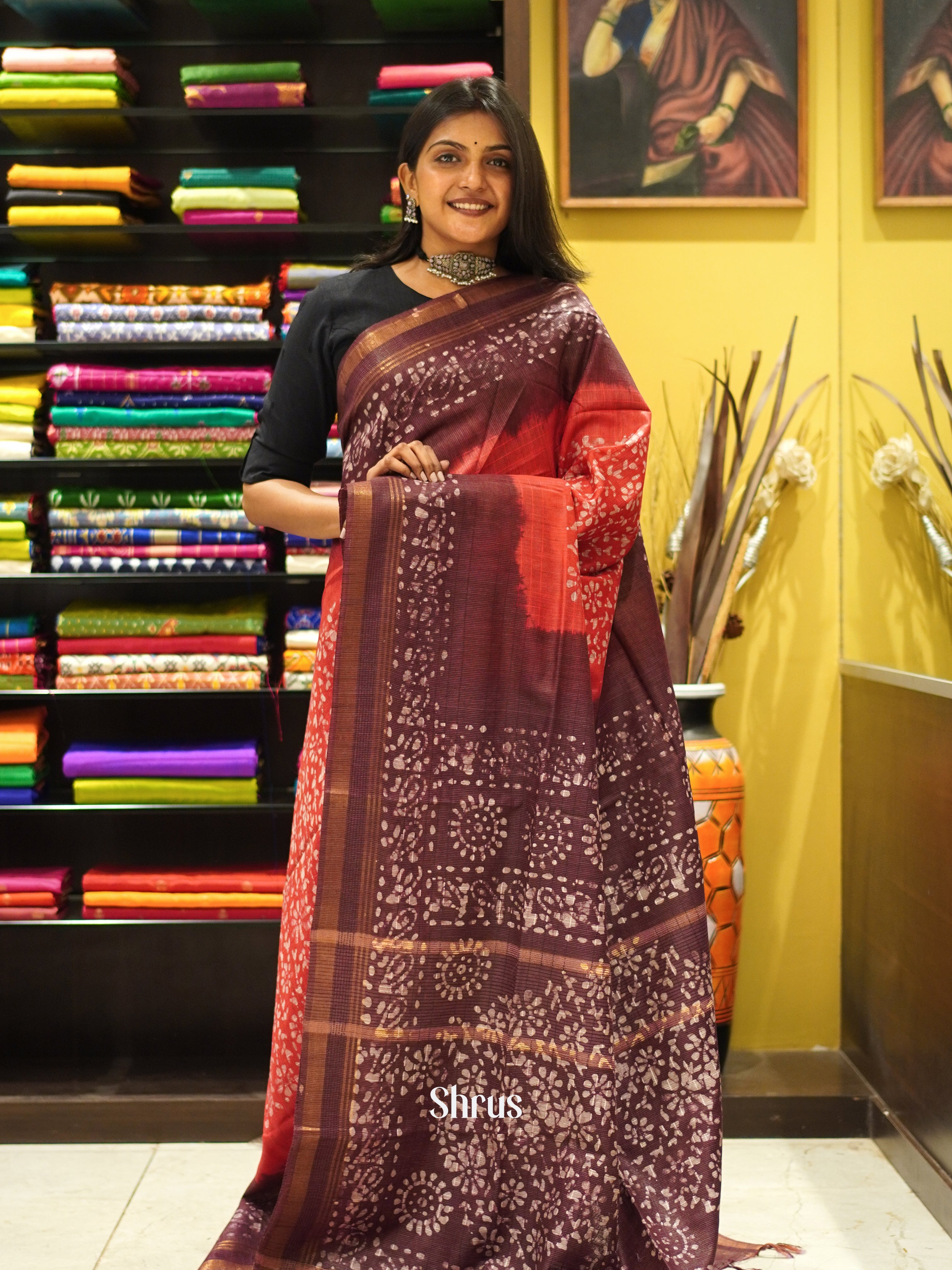 Elegant Red Bhatik saree boasts a stunning floral patterns on the body and a contrast Brown printed, Zari border. The contrast pallu adds a touch of glamour. Complete with a matching contrast blouse, this saree is the perfect choice for a polished look.