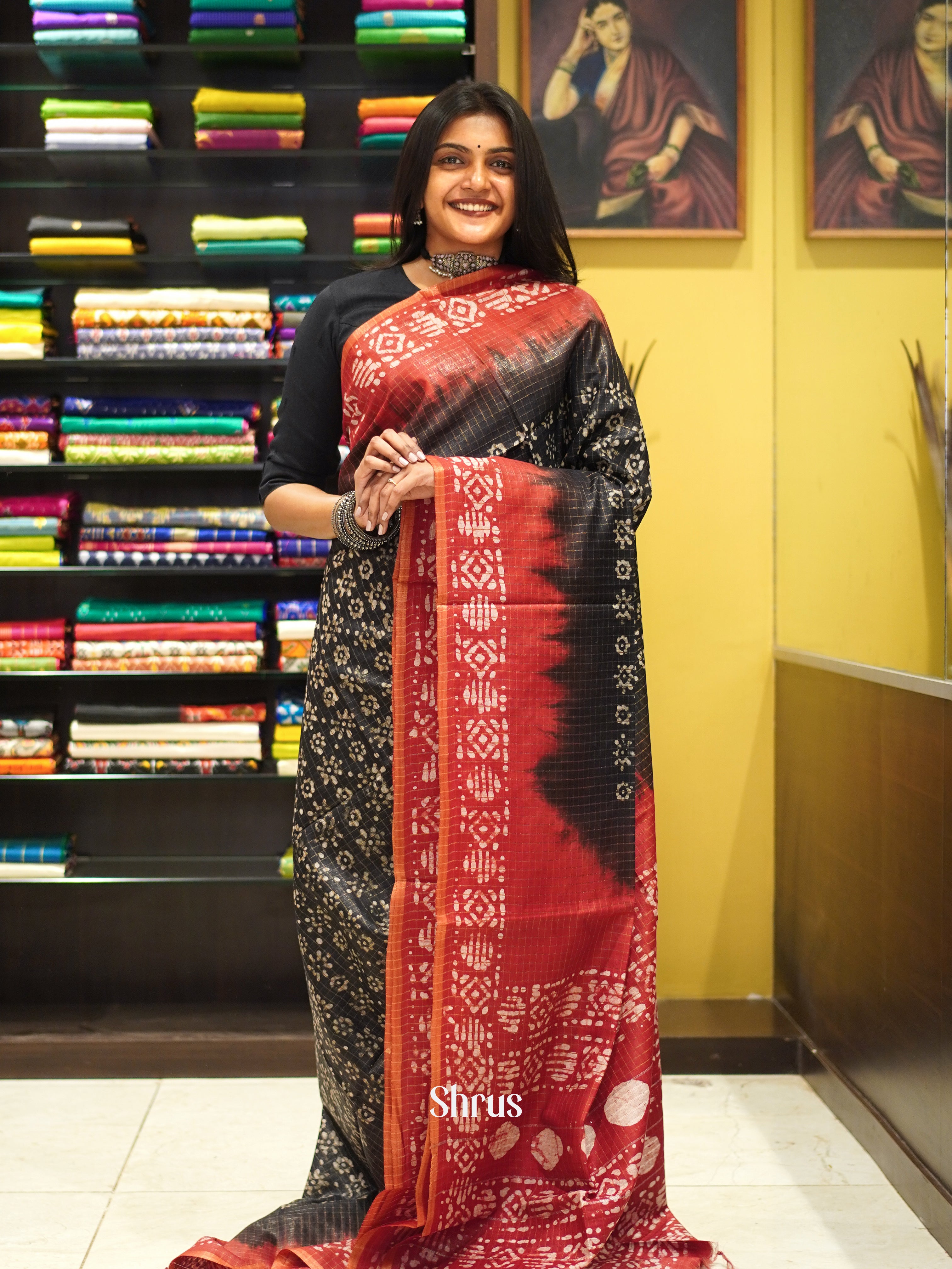 Pretty Black Bhatik saree boasts a stunning floral pattern , Zari checks on the body and a contrast Red printed, Zari border. The contrast pallu adds a touch of glamour. Complete with a matching contrast blouse, this saree is the perfect choice for a polished look.