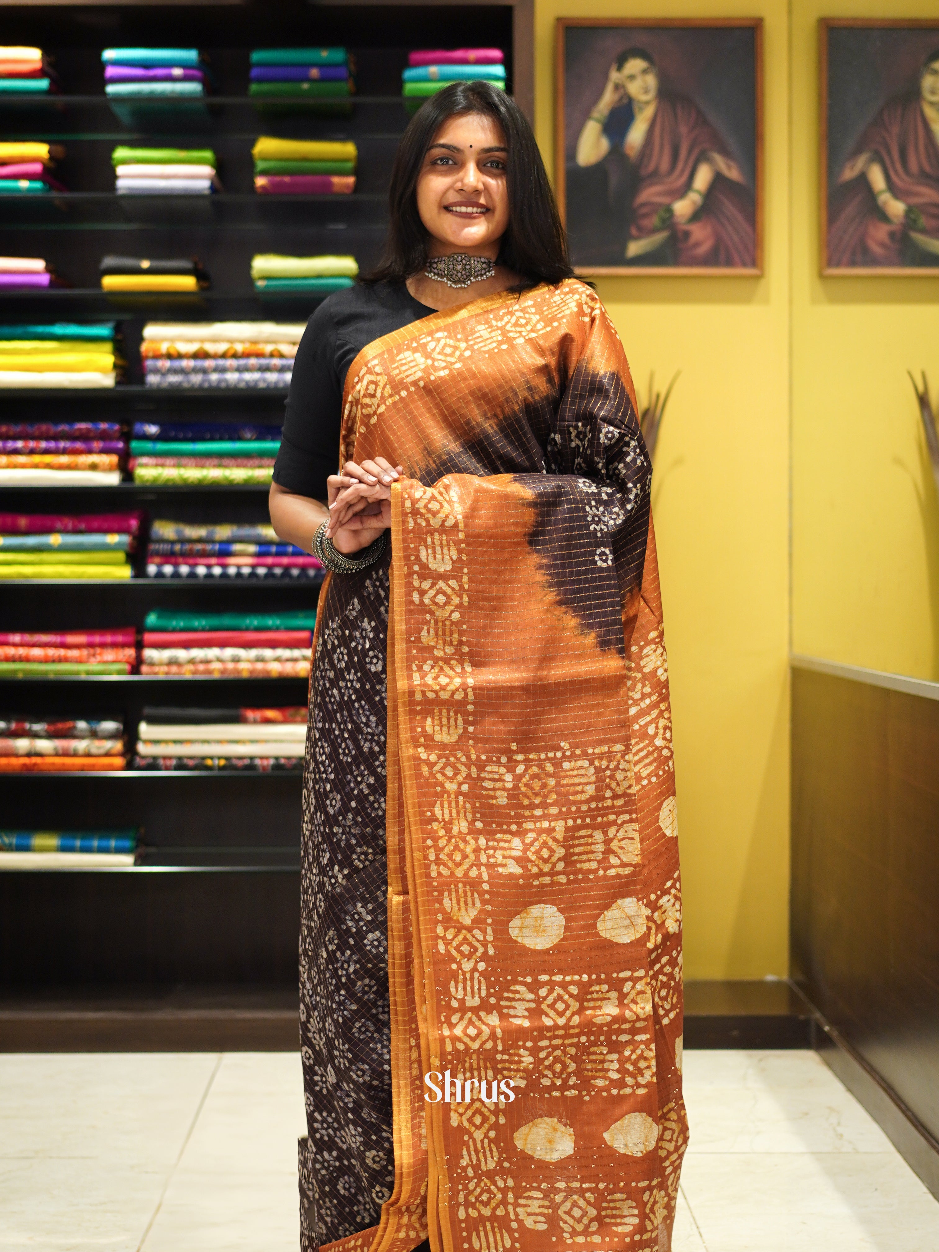 Very Pretty Brown Bhatik saree boasts a stunning floral pattern , Zari Stripes on the body and a contrast Light Brown printed, Zari border. The contrast pallu adds a touch of glamour. Complete with a matching contrast blouse, this saree is the perfect choice for a polished look.