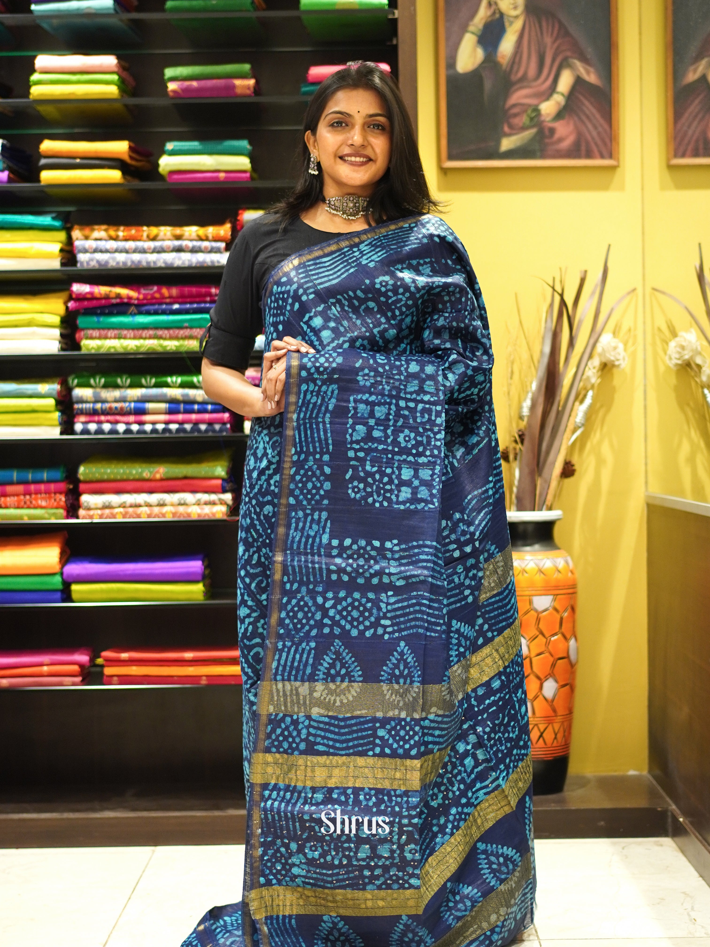 Pretty Blue Bhatik saree boasts a stunning floral pattern , Zari Stripes on the body and a thin Zari border. The self printed pallu adds a touch of glamour. Complete with a matching blouse, this saree is the perfect choice for a polished look.
