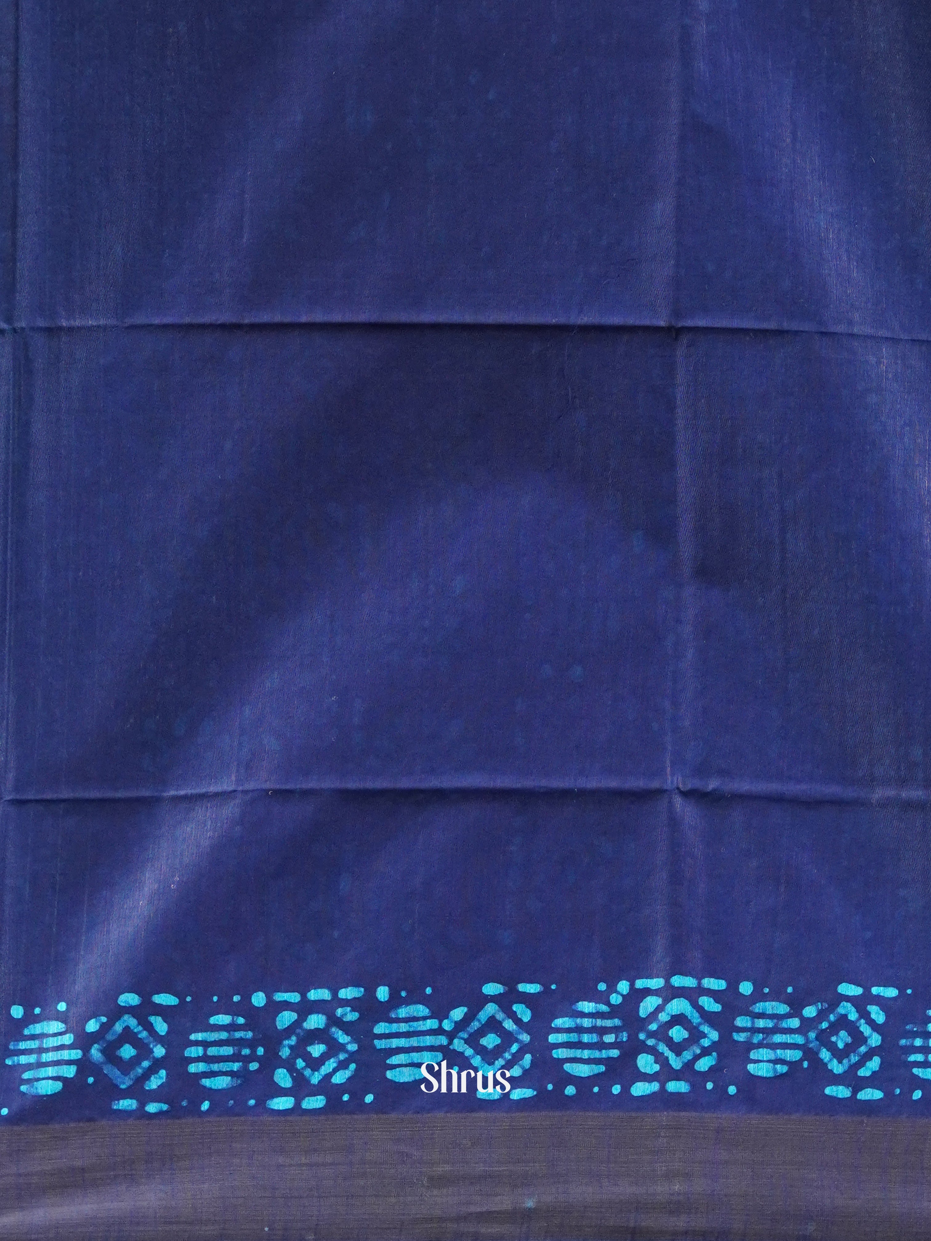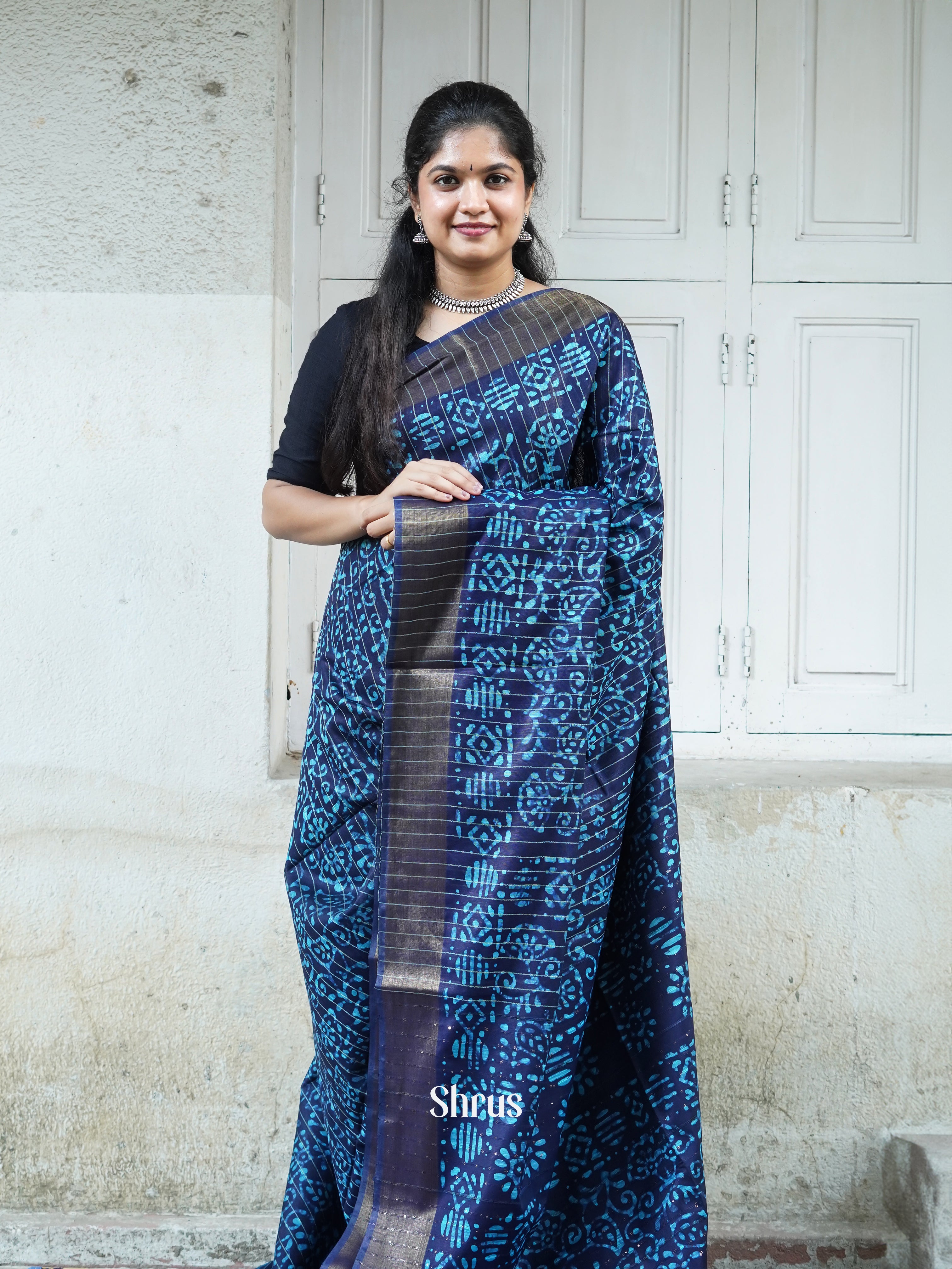 Pretty Blue Bhatik Saree showcases a stunning floral pattern and is finished with a zari border and printed pallu. The accompanying blouse complements the overall look with its simple design and border detailing.