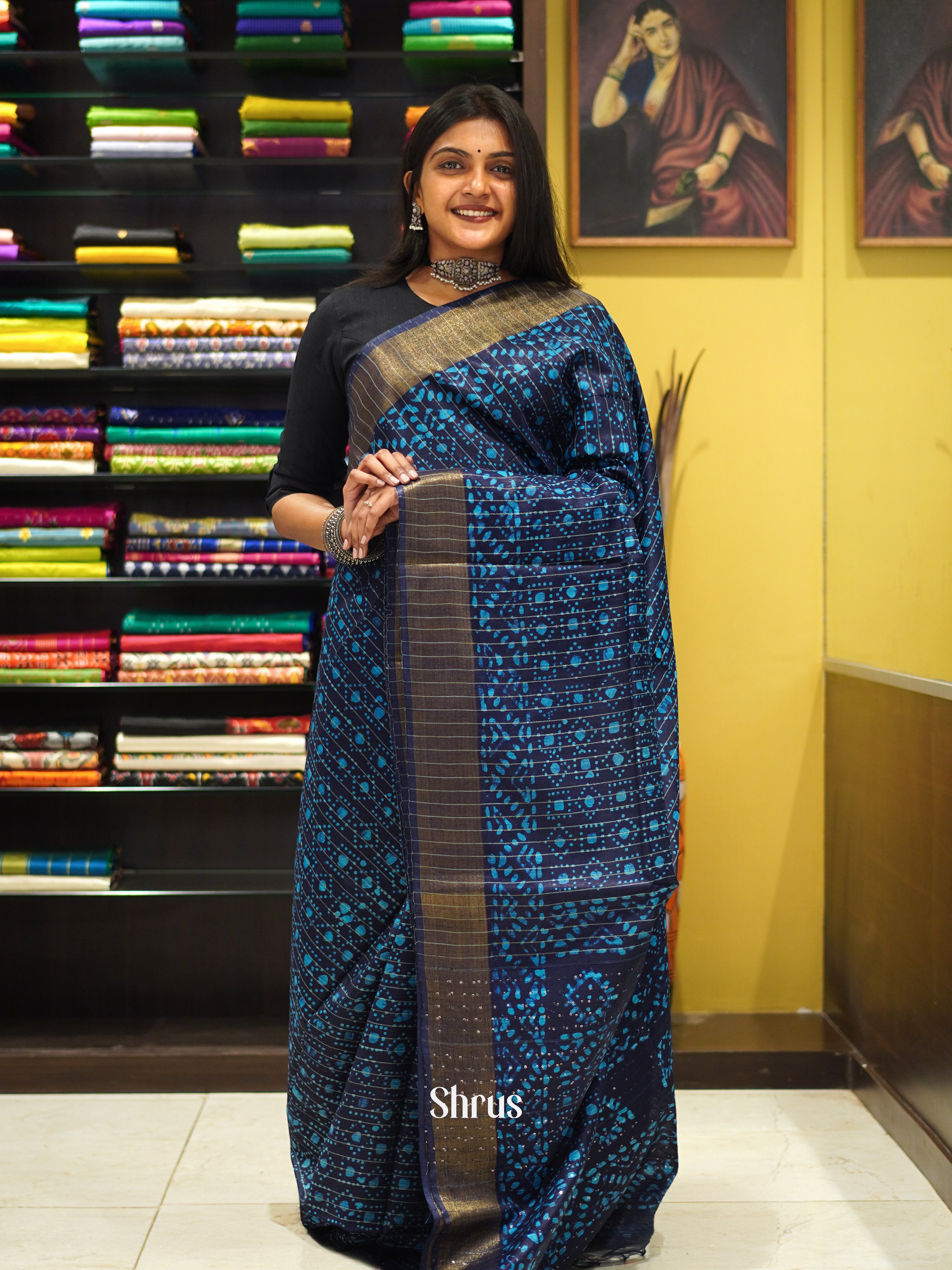Elegant Blue Bhatik saree boasts a stunning floral pattern , Zari Stripes on the body and a Zari border. The self printed pallu adds a touch of glamour. Complete with a matching blouse, this saree is the perfect choice for a polished look.