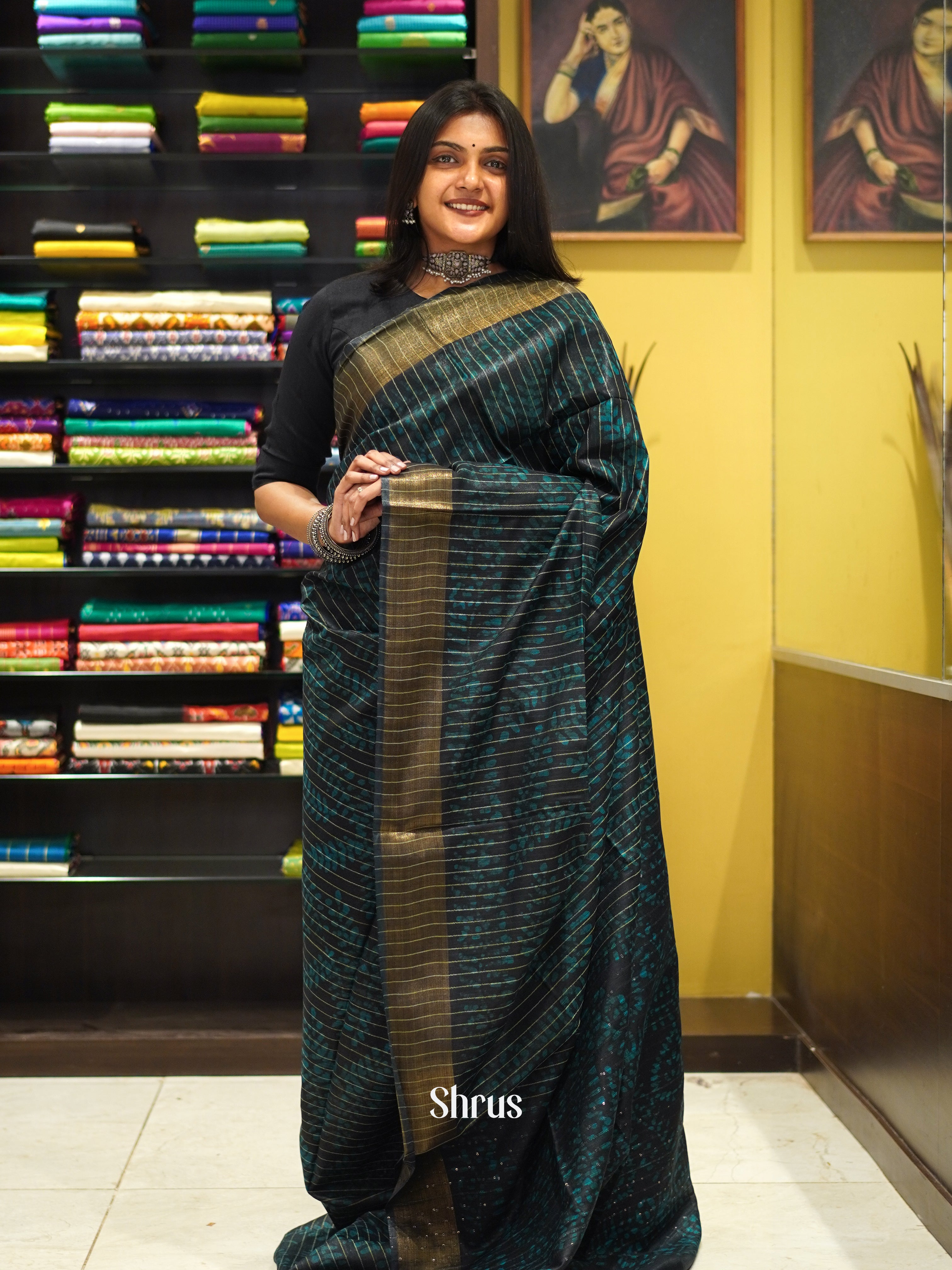 Elegant Black & Blue Bhatik saree boasts a stunning floral pattern , Zari Stripes on the body and a self Zari border. The self printed pallu adds a touch of glamour. Complete with a matching blouse, this saree is the perfect choice for a polished look.