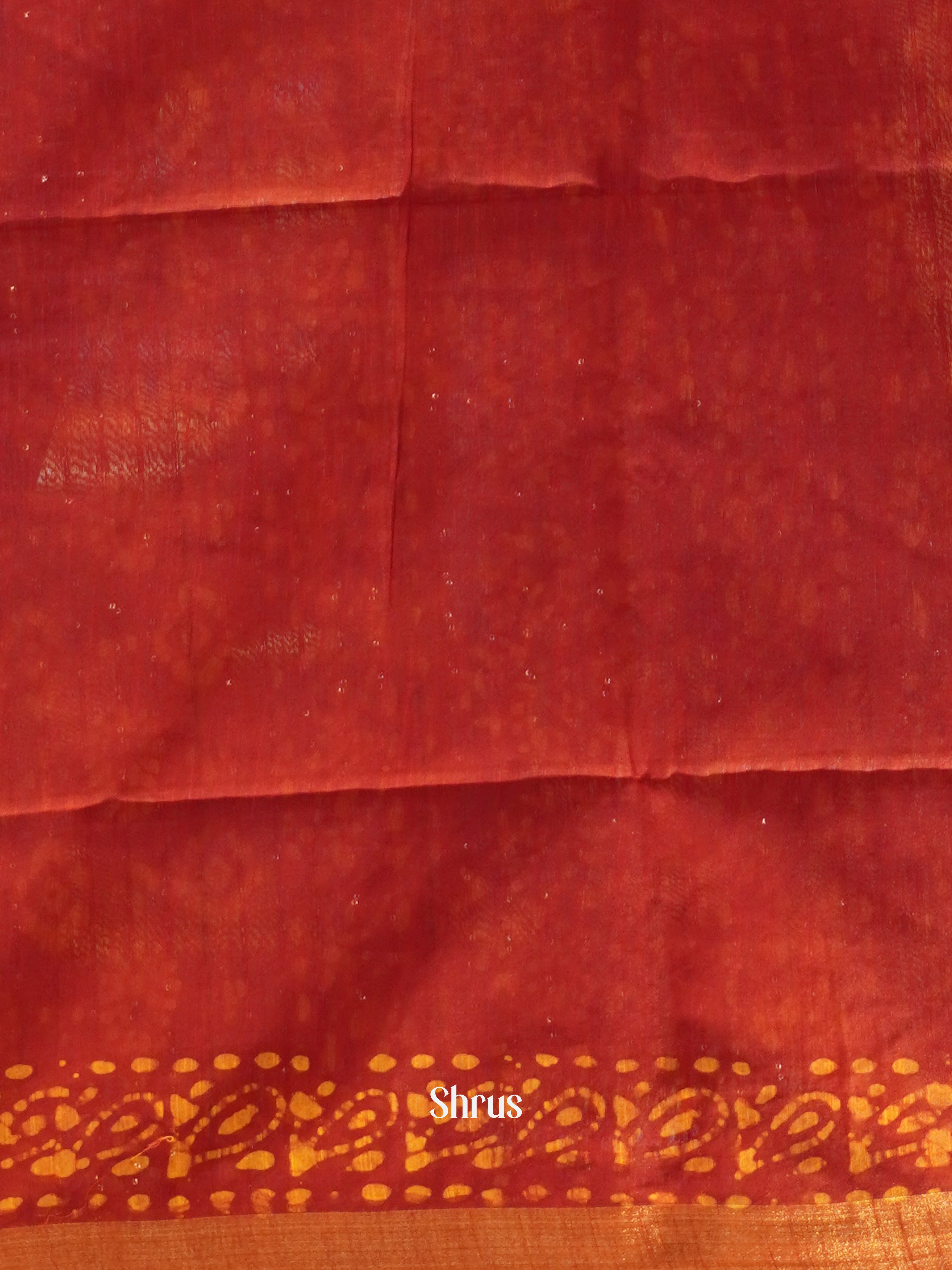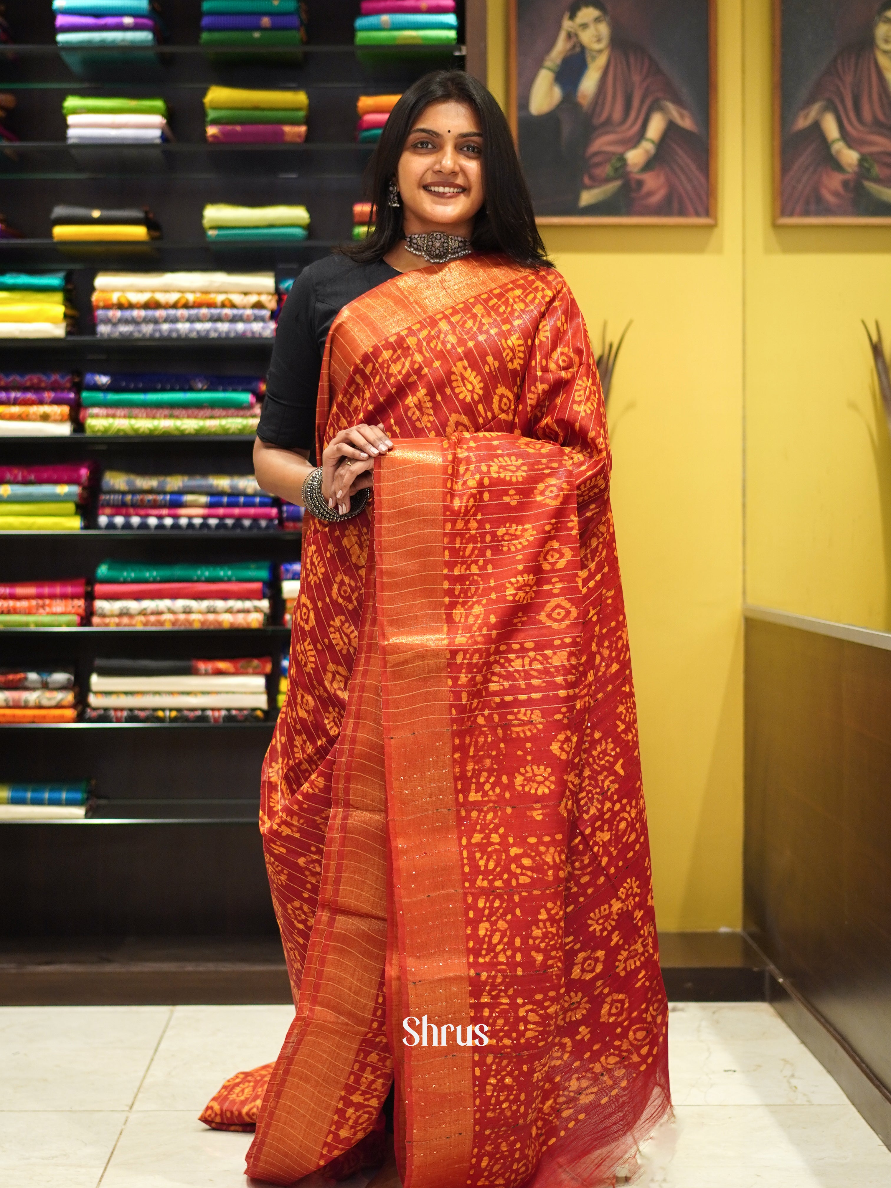 Elegant Red Bhatik saree boasts a stunning floral pattern, with Zari stripes on the body and a self Zari border. The pallu adds a touch of glamour. Complete with a matching blouse, this saree is the perfect choice for a polished look.