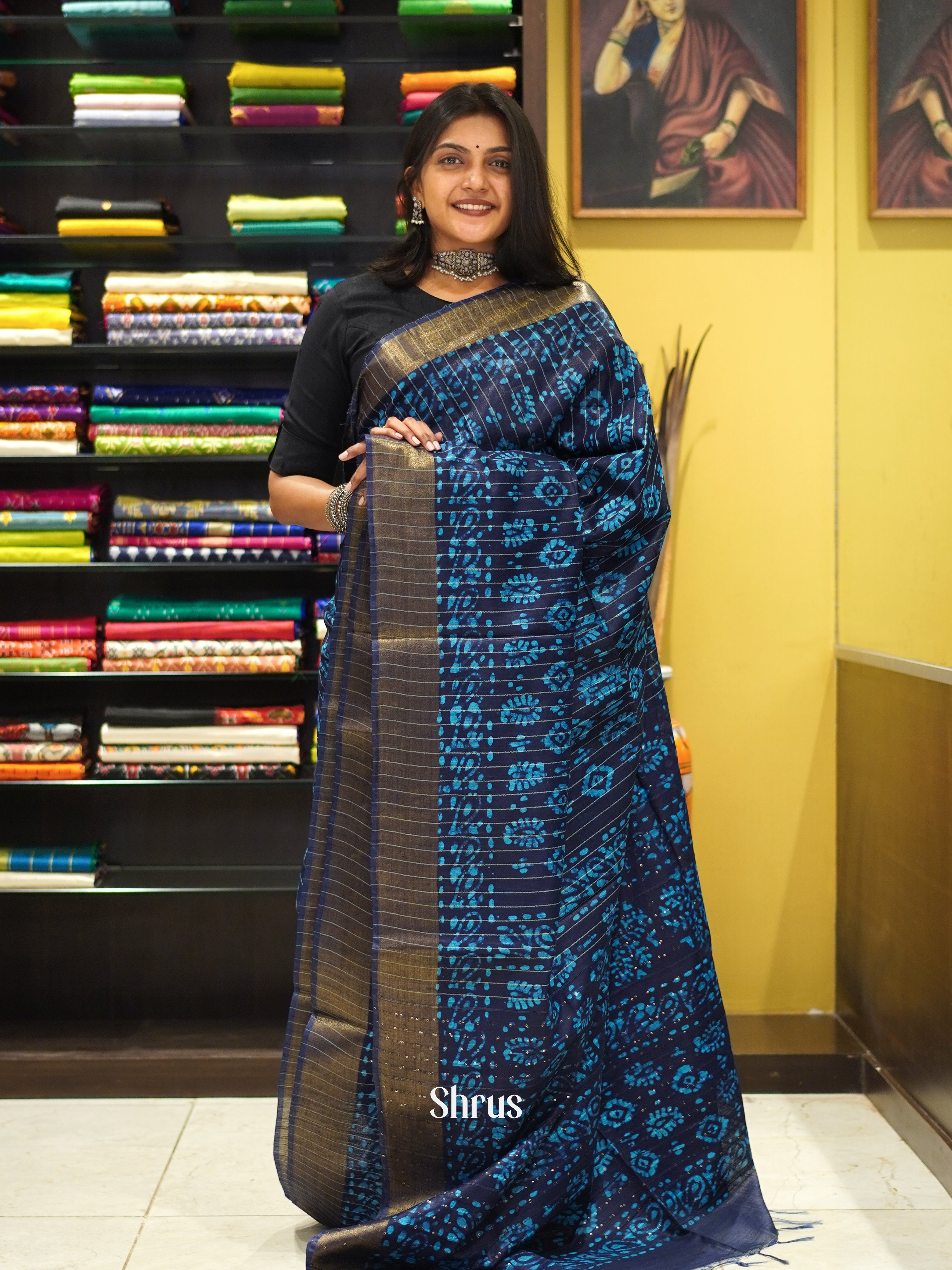 Pretty Blue Bhatik saree boasts a stunning floral pattern, with Zari stripes on the body and a self Zari border. The pallu adds a touch of glamour. Complete with a matching blouse, this saree is the perfect choice for a polished look.