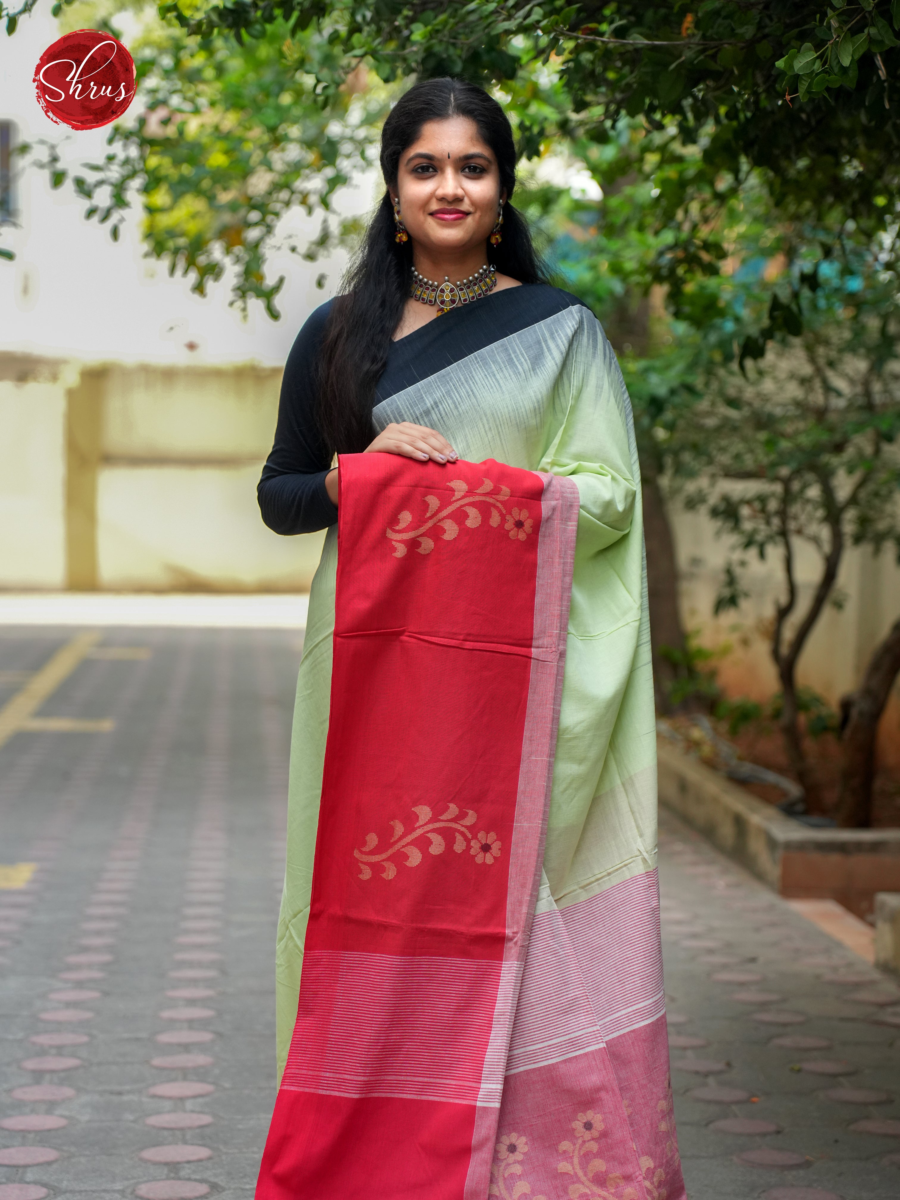 Very Pretty Green Bengal Cotton Saree features a charming plain body and is bordered with a vibrant Red. Its sophisticated Red pallu includes a Stripes design, and it is accompanied by a plain self Blouse with a border.