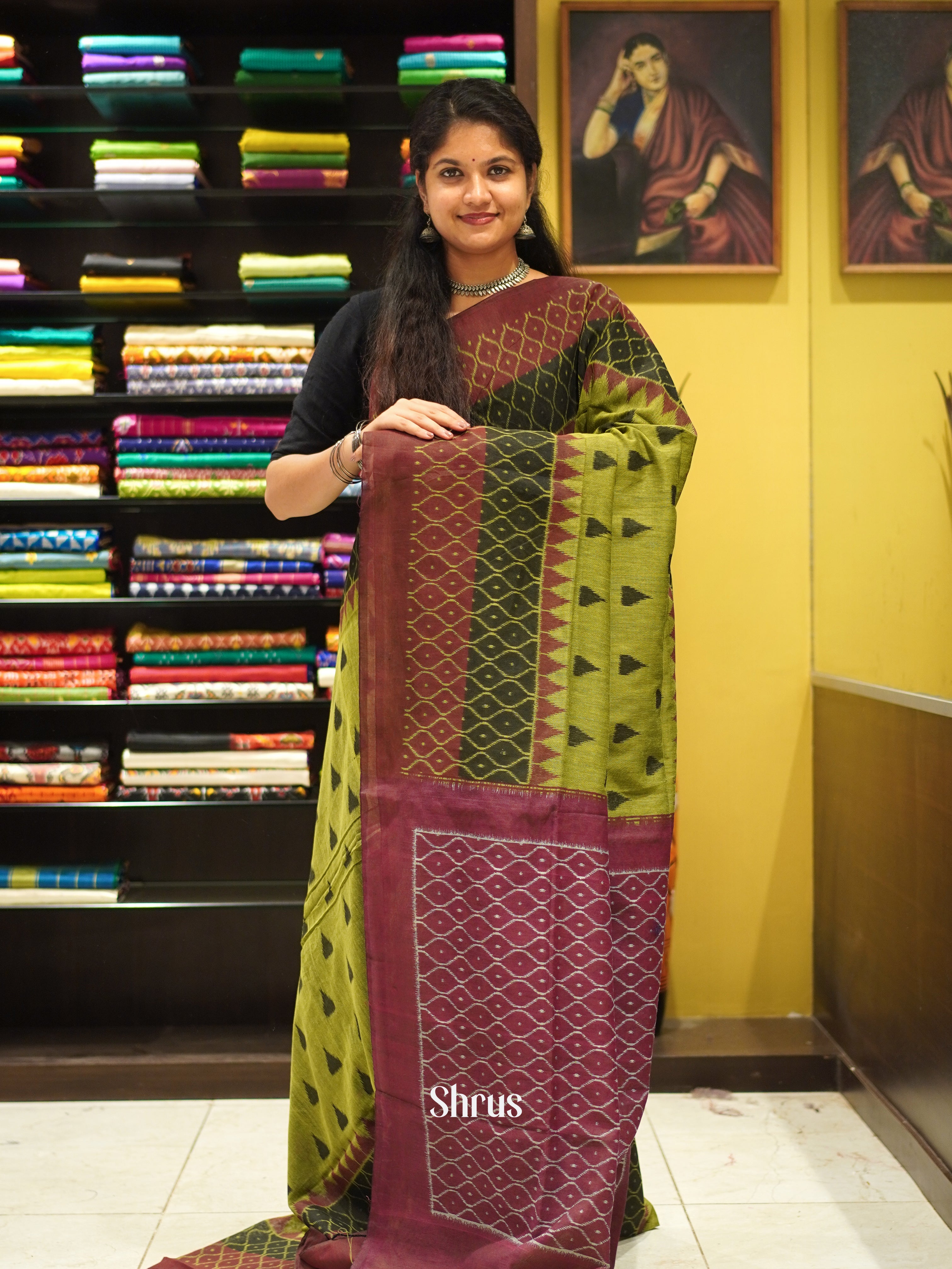 Pretty Green Bengal cotton Saree boasts a delightful floral print on its body and is accented by a striking contrast Brown Border. Its elegant Maroon pallu is complemented by a simple, self-colored Blouse.