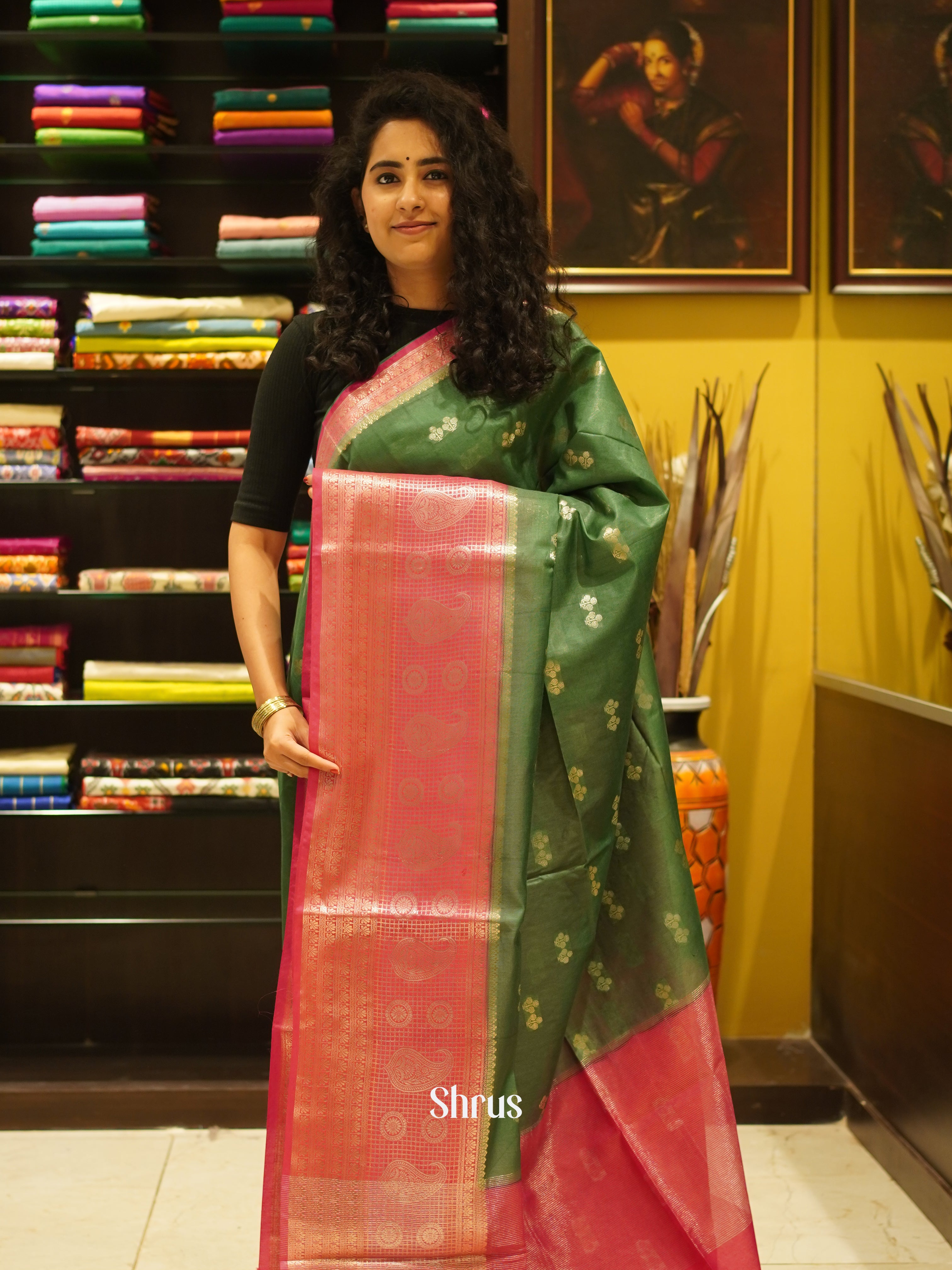 Elegant Green Semi Silkcotton Saree is adorned with zari woven buttas on the body. The Pink zari woven border and brocade pallu add to the elegance of this saree. A complementary Pink blouse with border, featuring zari butta detailing, completes the ensemble.