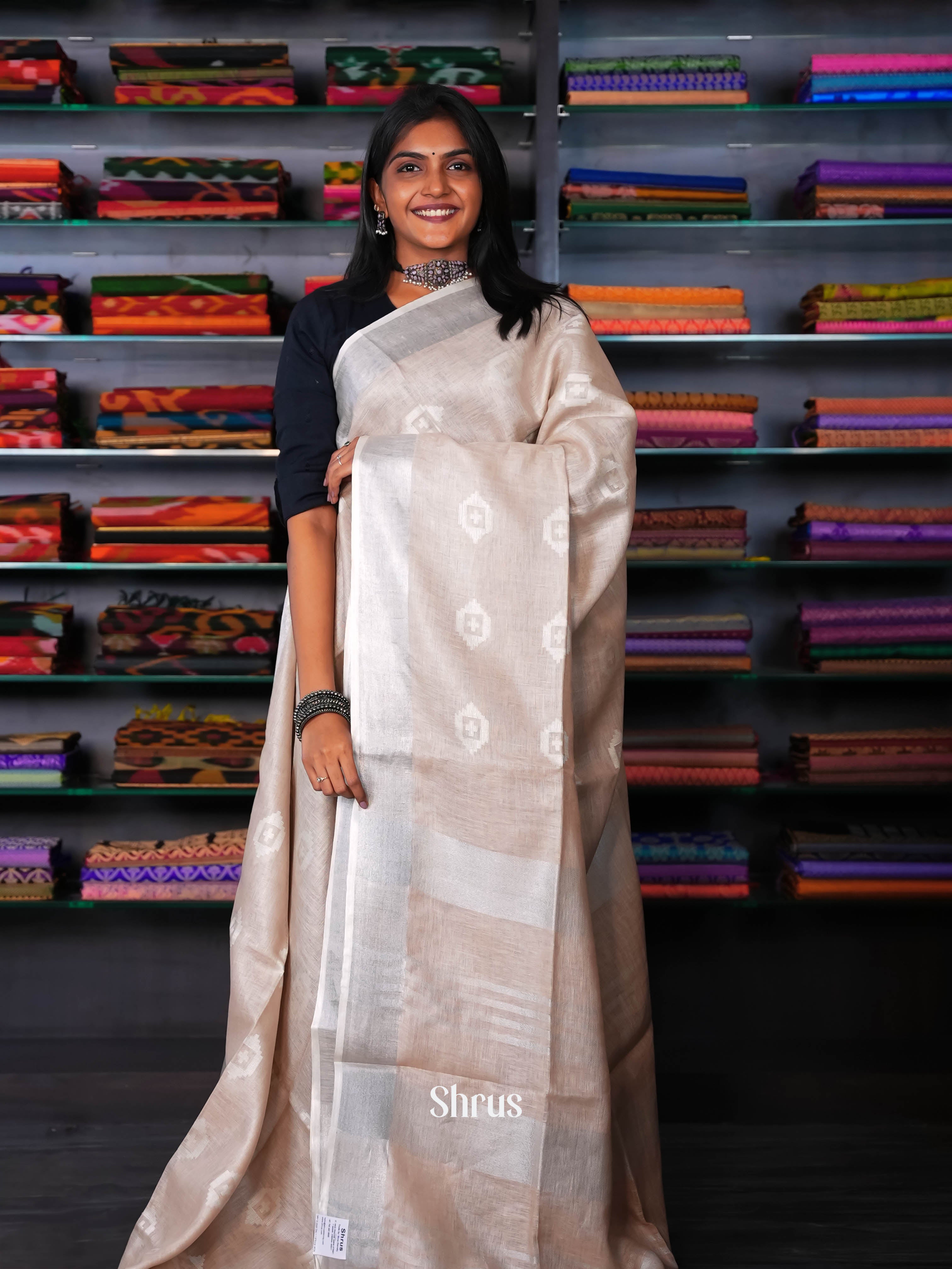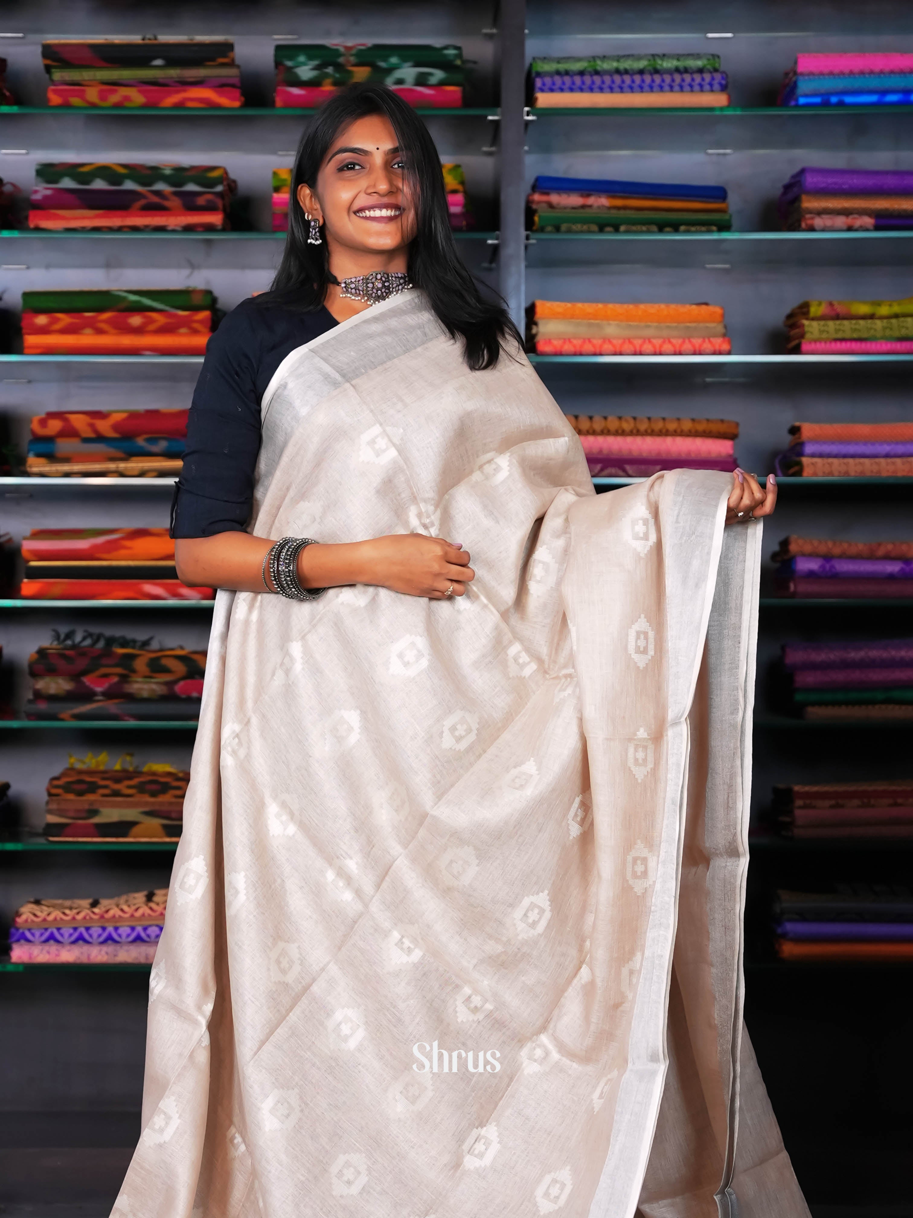 Charming Cream Linen saree with thread woven buttas on the body that adds charm. The self zari border & pallu add to its beauty. It comes with a plain grey blouse to perfectly complement the design