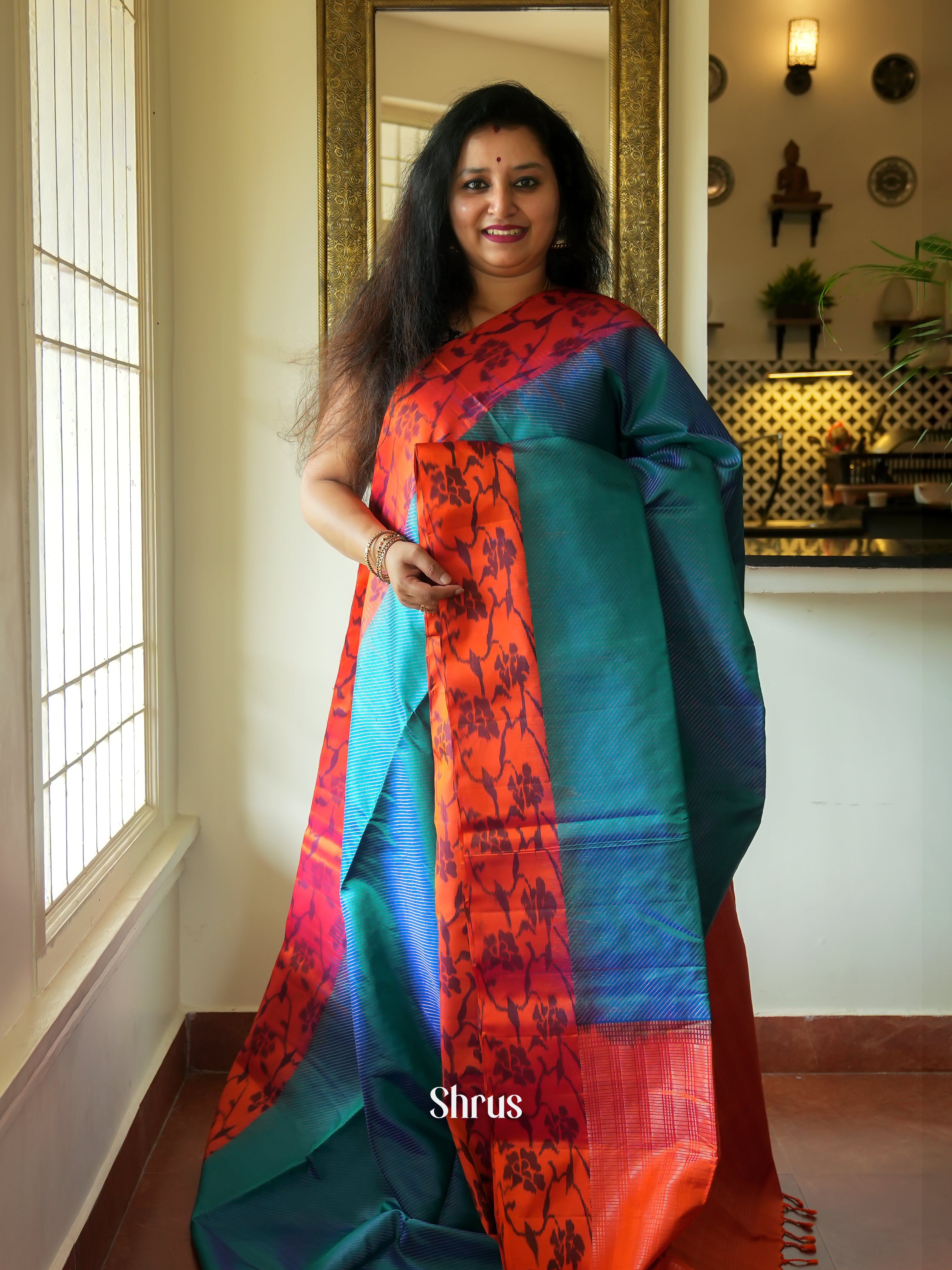 Vibrant Blue Soft Silk Saree features a zari woven diagonal Stipes on the body, adorned with a timeless charm through its contrast Orange ikkat floral woven border and pallu. Complete the ensemble with the matching Orange Ikkat floral woven blouse