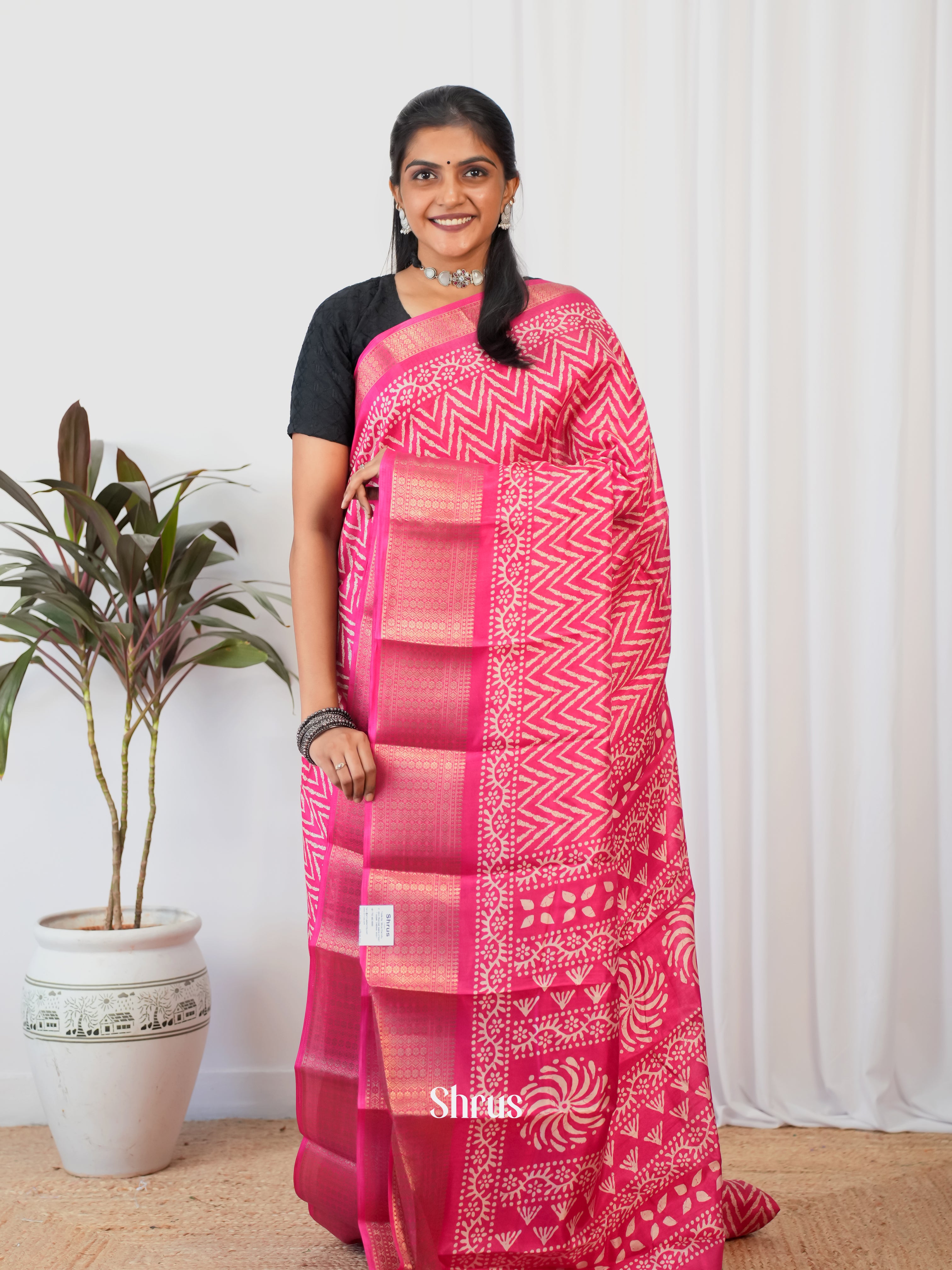 Beautiful Pink Semi Crepe Saree is adorned with a stunning floral print and accented with a self zari border, adding a touch of elegance. The saree comes with a matching self-printed blouse featuring a zari border, perfectly complementing the overall look.