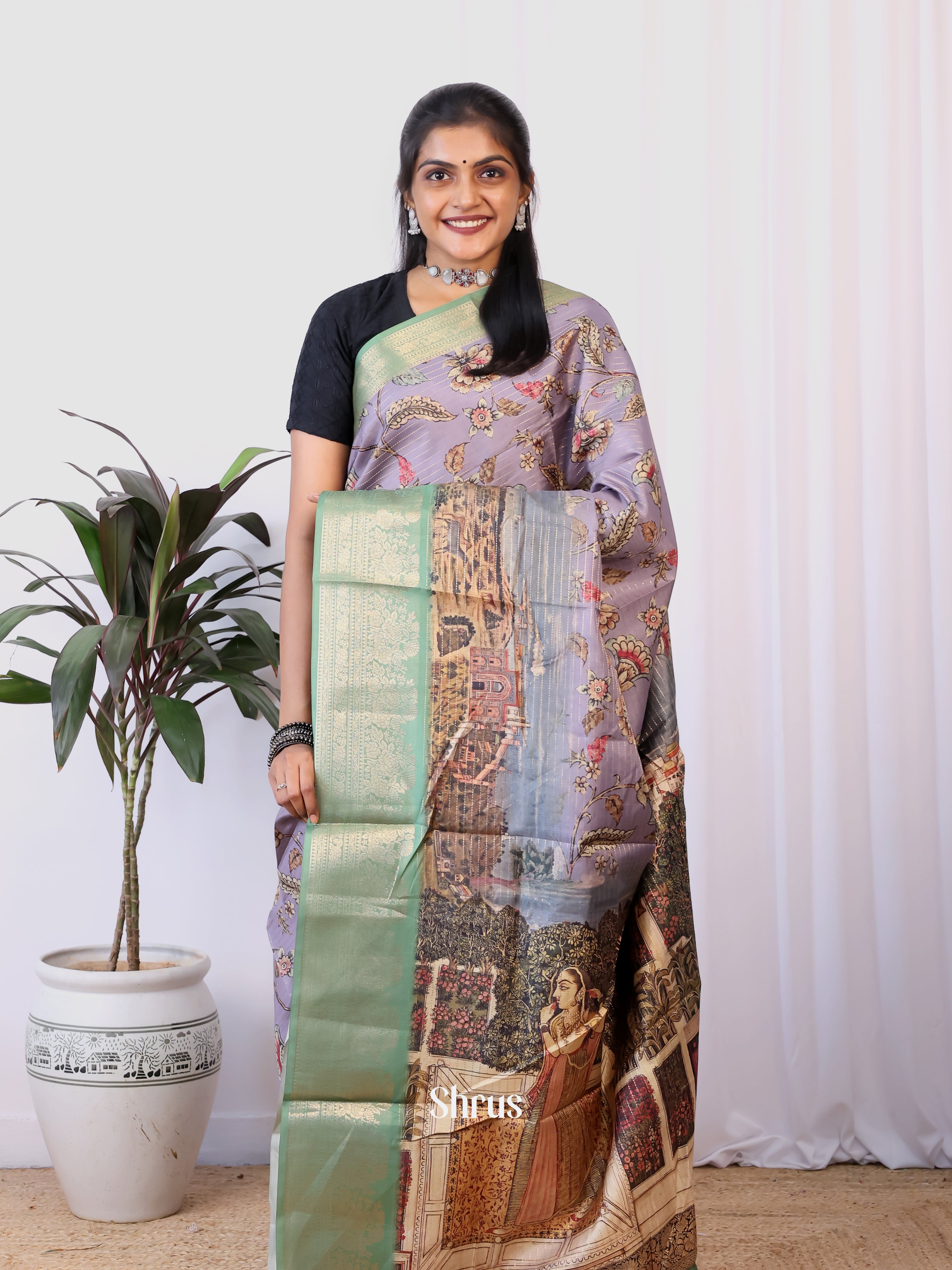 Beautiful Purple Semi Dola silk Saree showcases stunning kalamkari prints and intricate zari checks for a charming design. A contrast Green zari border adds an elegant touch, while the self striped blouse adds a chic twist to this splendid piece.