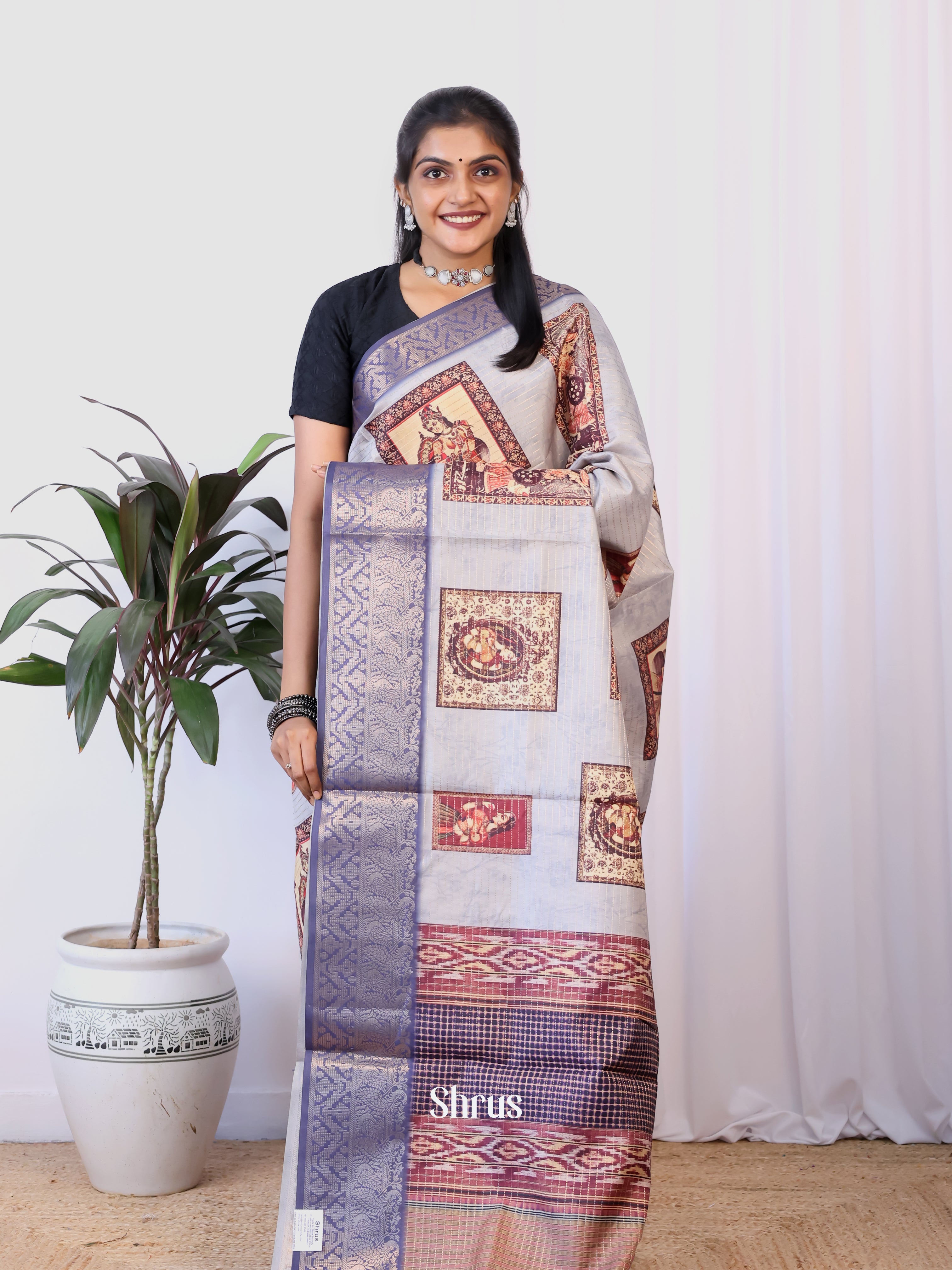 Pretty Grey Semi Dola silk Saree showcases stunning kalamkari prints and intricate zari checks for a charming design. A Purple zari border adds an elegant touch, while the matching blouse adds a chic twist to this splendid piece.