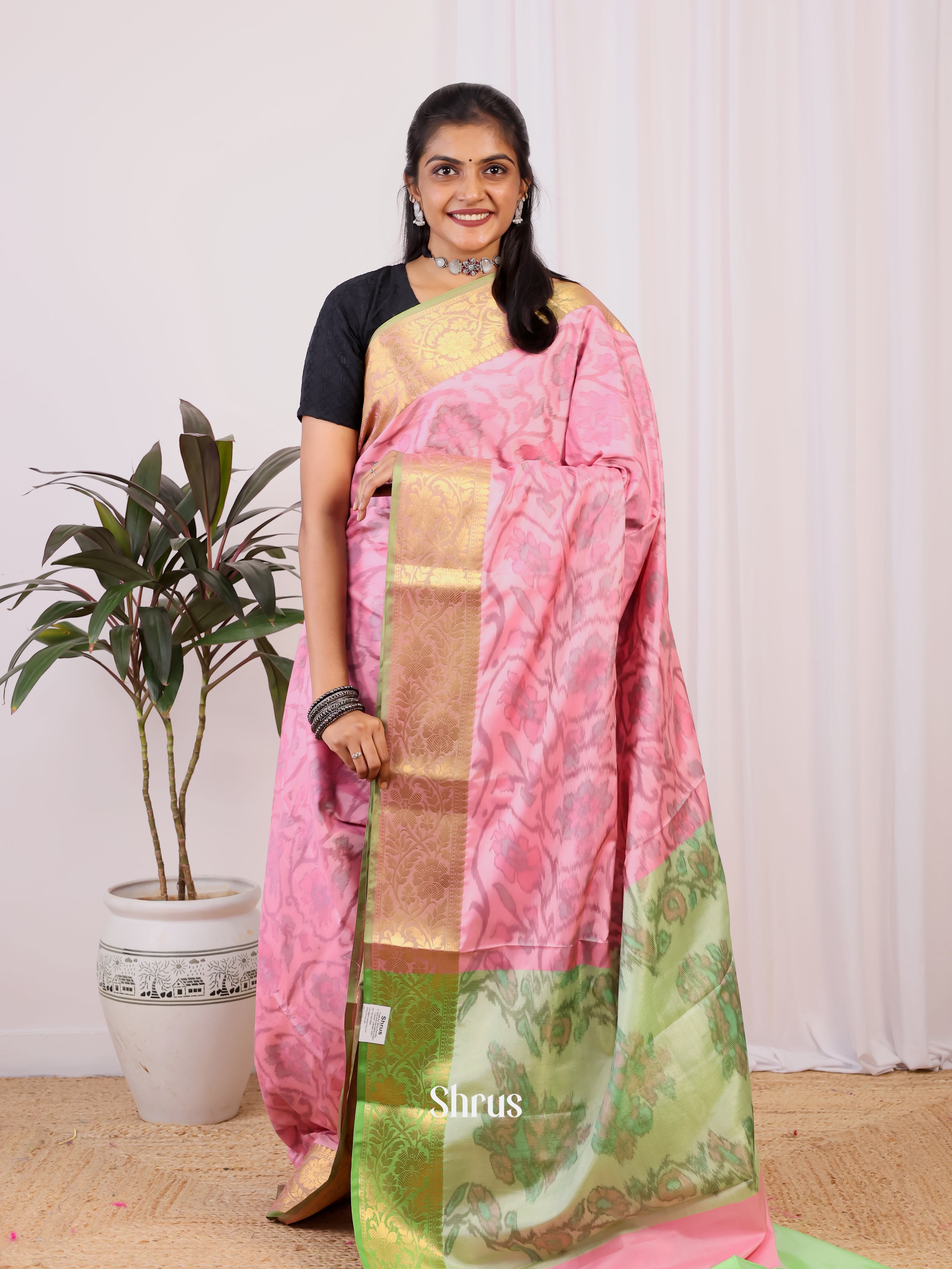 Charming Pink Semi Ikkat Saree features a thread woven ikkat floral nestling on the body and is accented with a contrast Green zari border. The saree is further enhanced by a contrasting Green ikkat woven pallu and plain blouse, creating a perfectly fitted look.