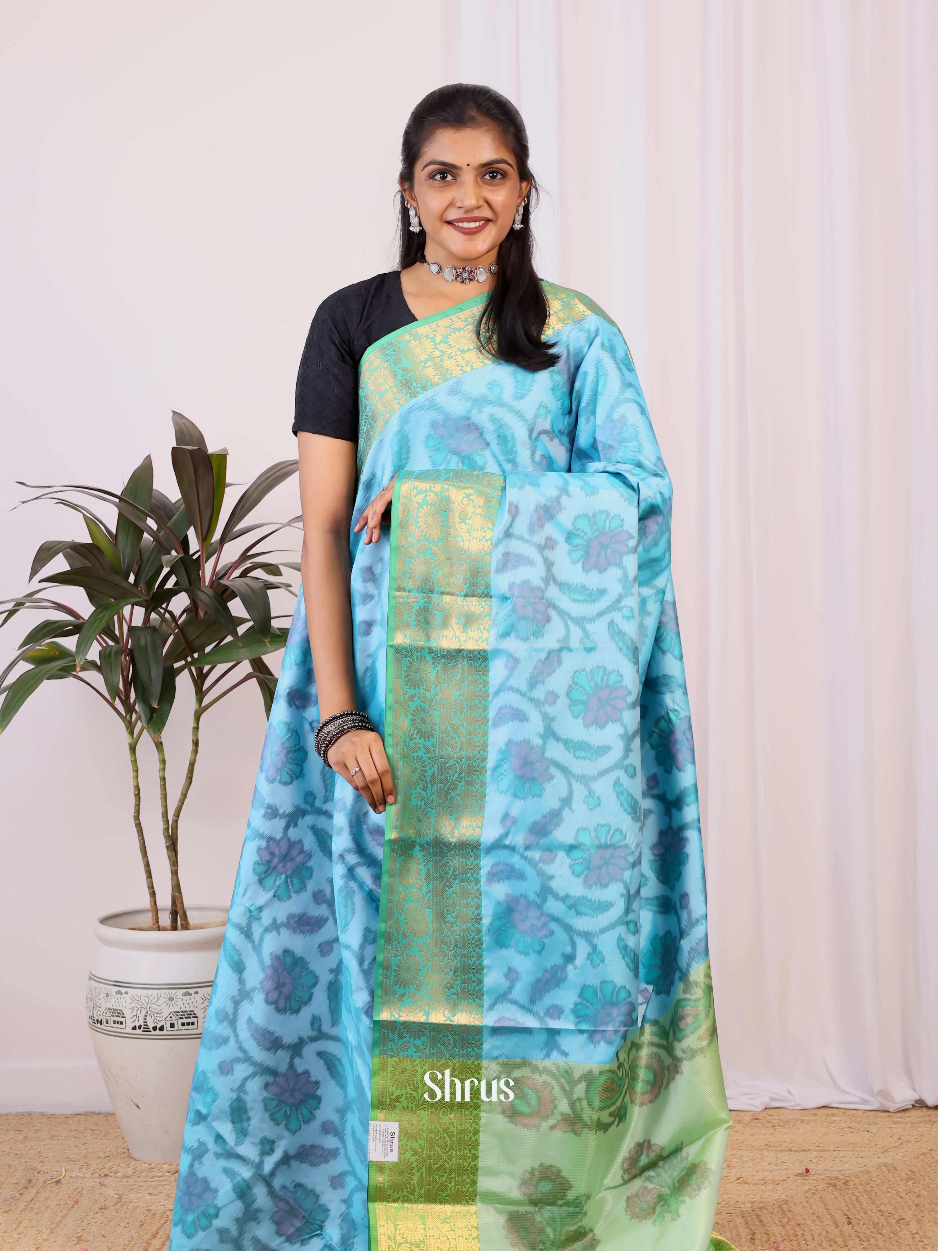 Elegant Blue Semi Ikkat Saree features a thread woven ikkat floral nestling on the body and is accented with a contrast Green zari border. The saree is further enhanced by a contrasting Green ikkat woven pallu and plain blouse, creating a perfectly fitted look.