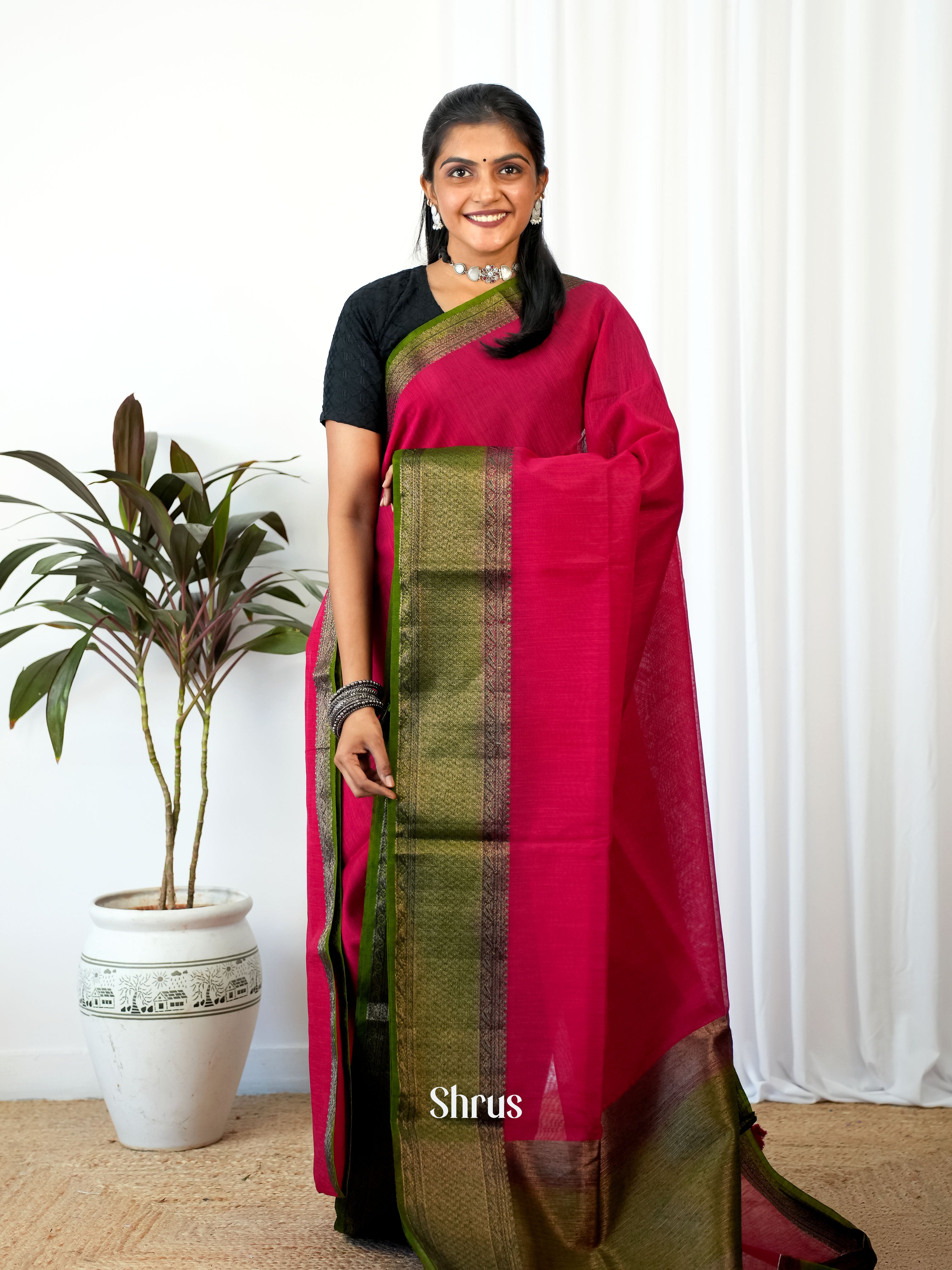 Pretty Red Semi Jute Saree features a plain body, contrast Green zari border, and a complementary pallu. Its ensemble is completed with a plain Green blouse with a zari border.