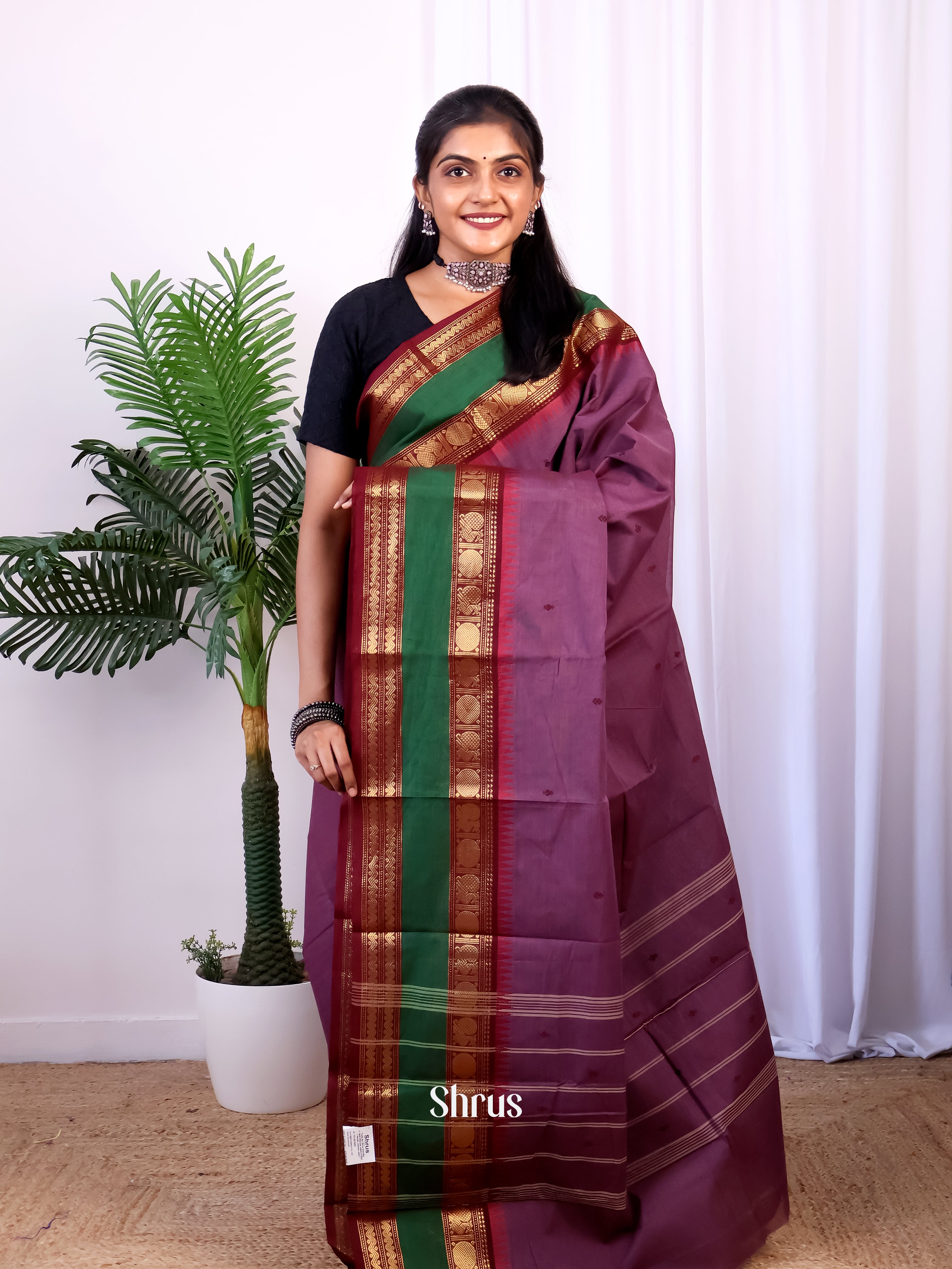 Beautiful Purple Chettinad Cotton saree enchants with intricate thread woven buttas adorn the body, while a striking Maroon zari woven border adds a pop of contrast. The self-striped pallu adds a touch of sophistication to complete the look..