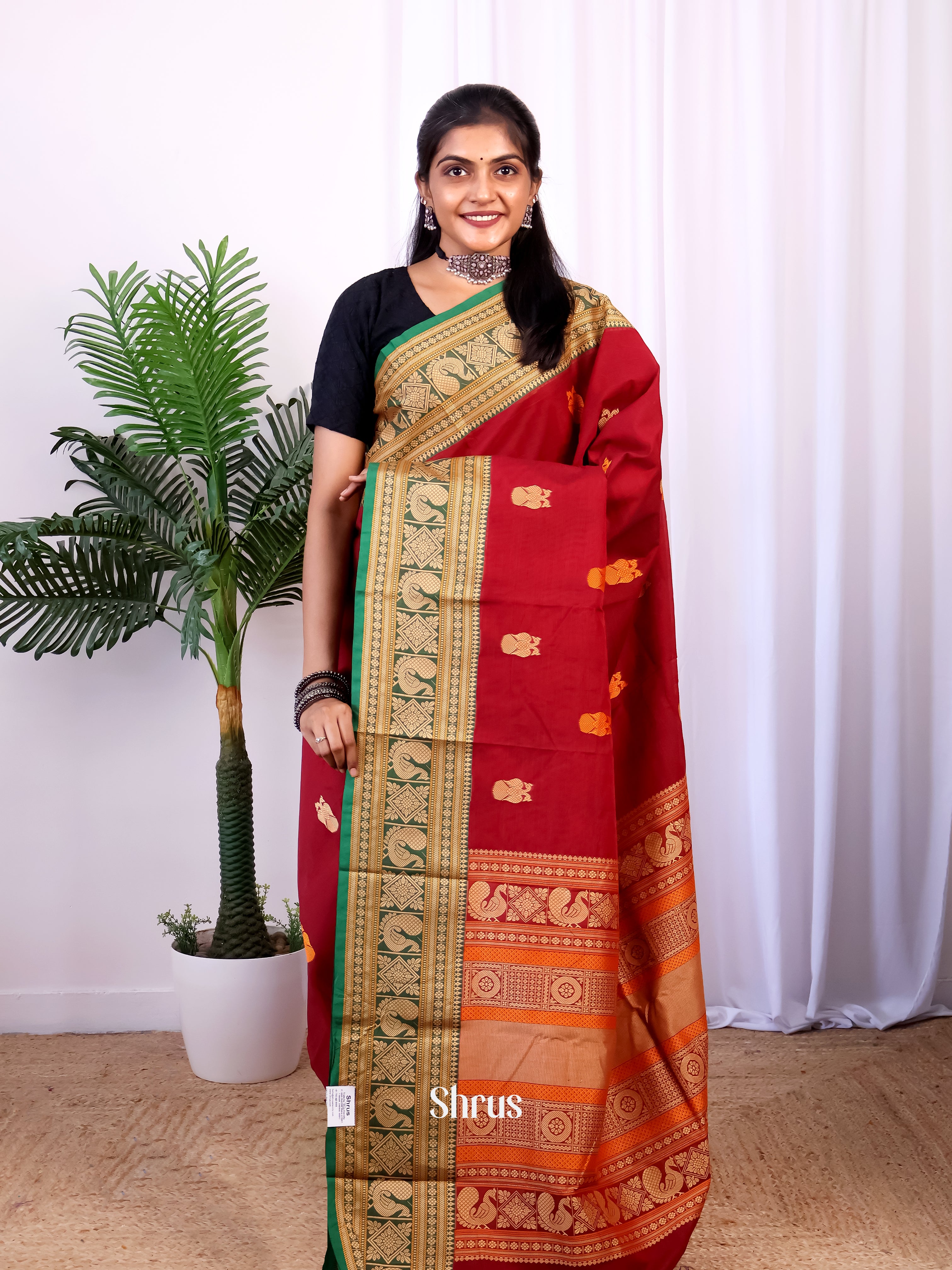 Pretty Red Chettinad Cotton saree enchants with intricate thread woven buttas adorn the body, while a striking green woven border with peacock motifs adds a pop of contrast. The self woven pallu adds a touch of sophistication to complete the look..