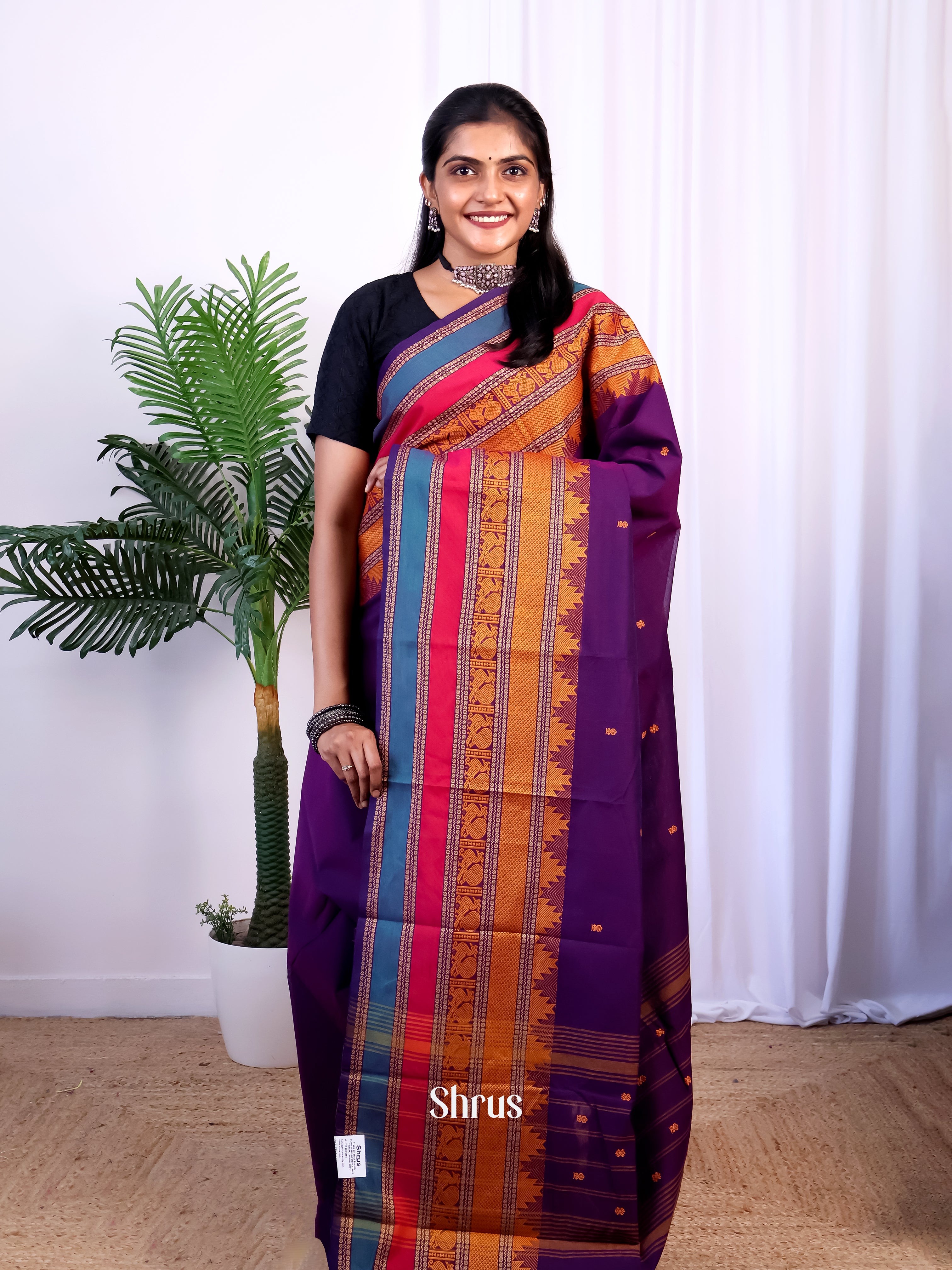 Very Pretty Violet Chettinad Cotton saree enchants with intricate thread woven buttas adorn the body, while a striking thread woven border with peacock buttas adds a pop of contrast. The self woven pallu adds a touch of sophistication to complete the look..