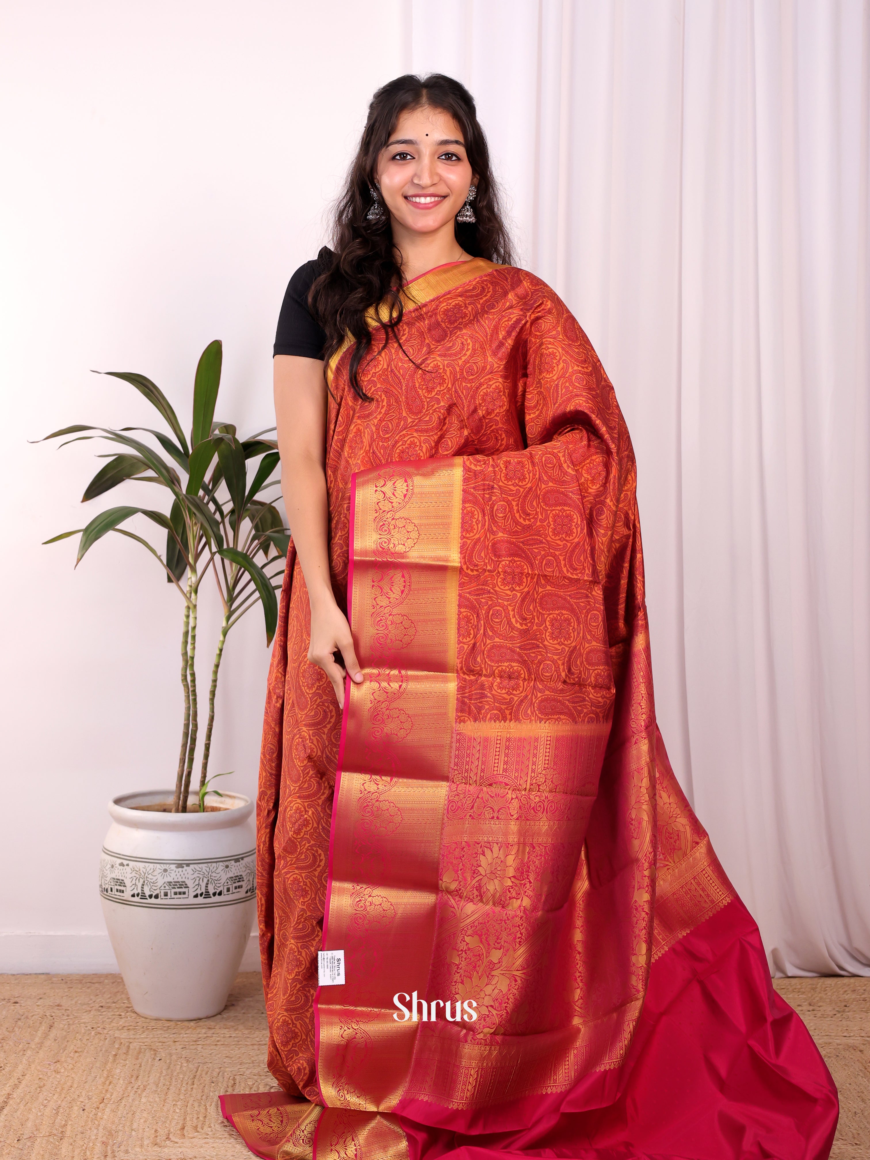 Brick & Maroon - Printed Silk Saree