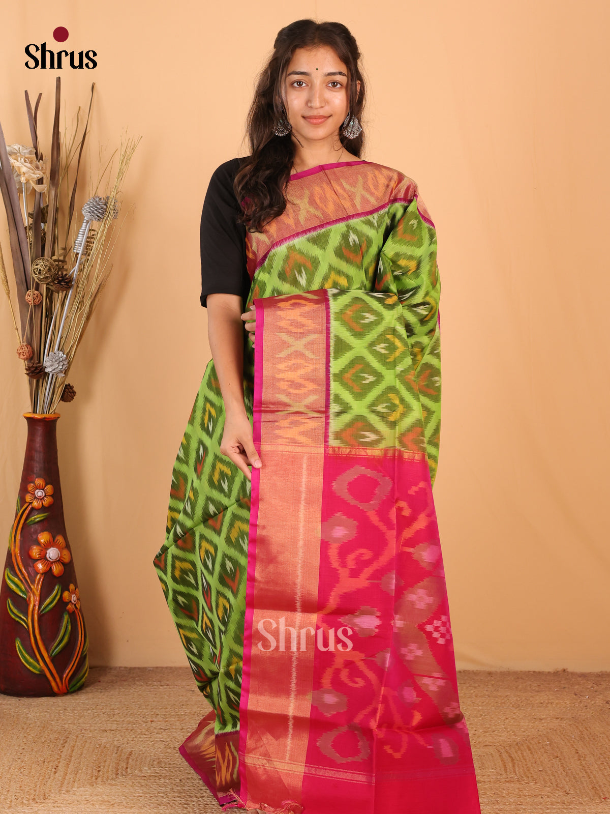 Beautiful Green pochampally silk cotton saree with intricate ikat patterns looks aesthetically elegant. The splendid contrast Maroon ikkat Border & Pallu comes with ikkat floral pattern lends compliments Comes with a Plain Maroon blouse with border completes the ensemble