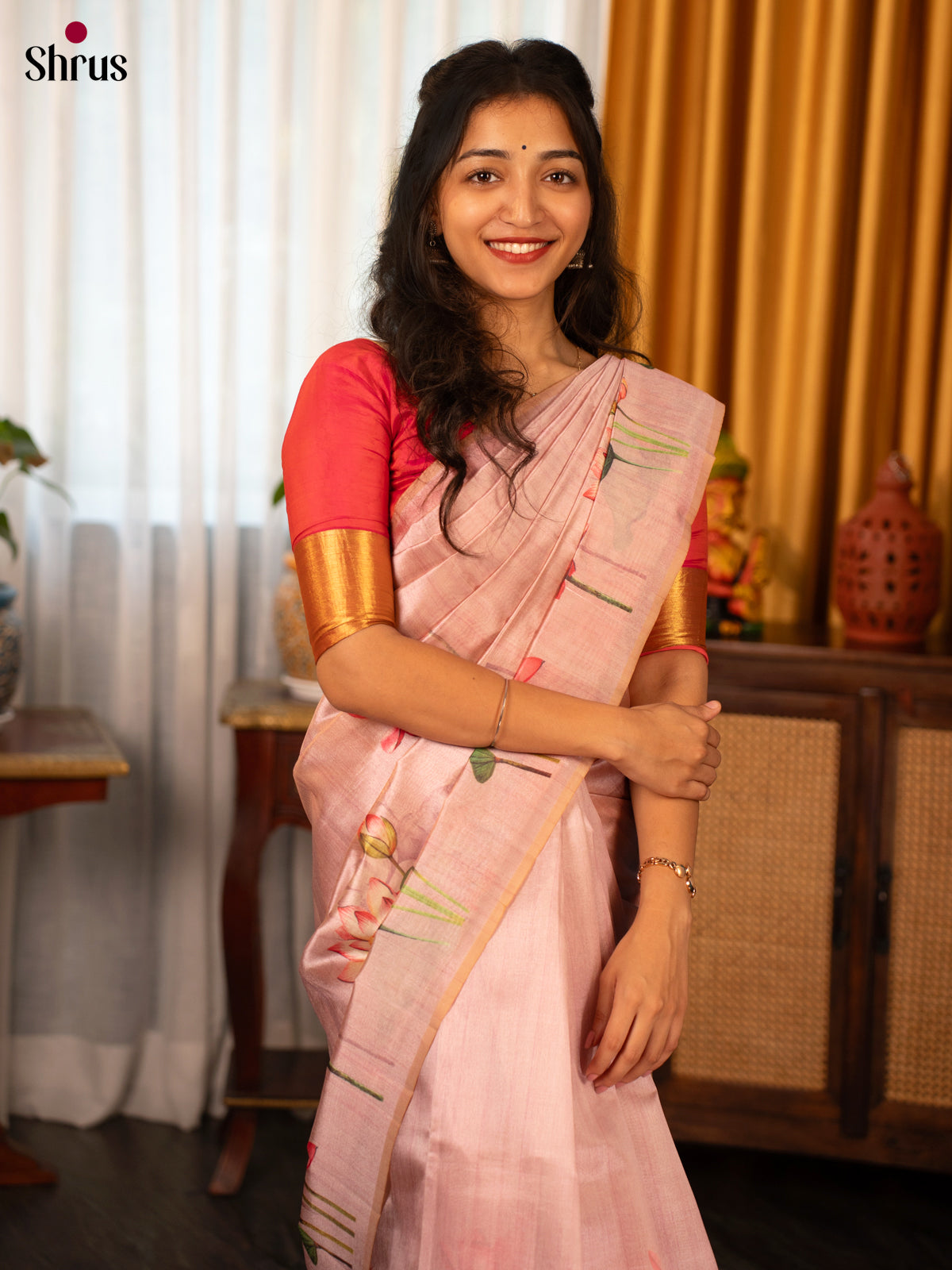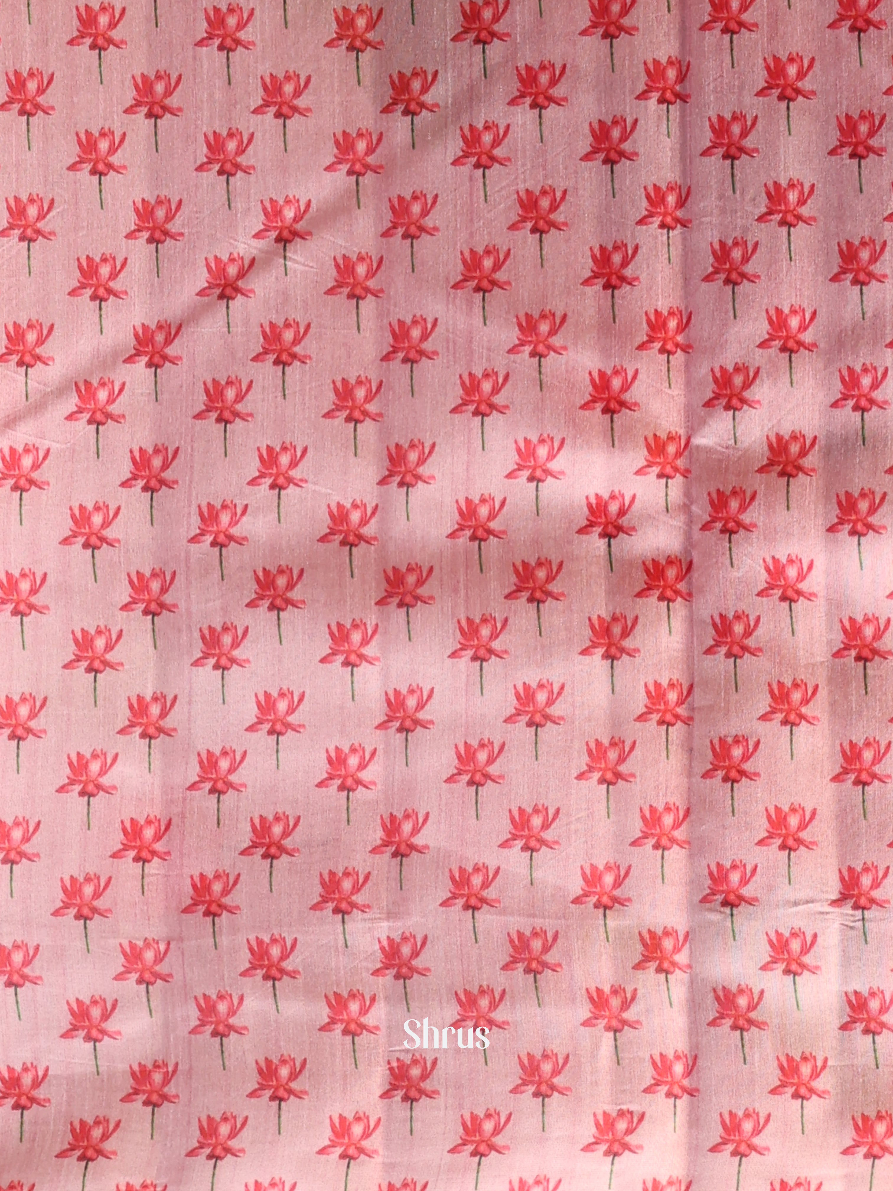 Pink Semi Tussar saree features a beautiful Pichwai floral print on its body and is enhanced with a self zari woven border. The self printed Pallu adds to its charm and is accompanied by a self blous , completing the ensemble.