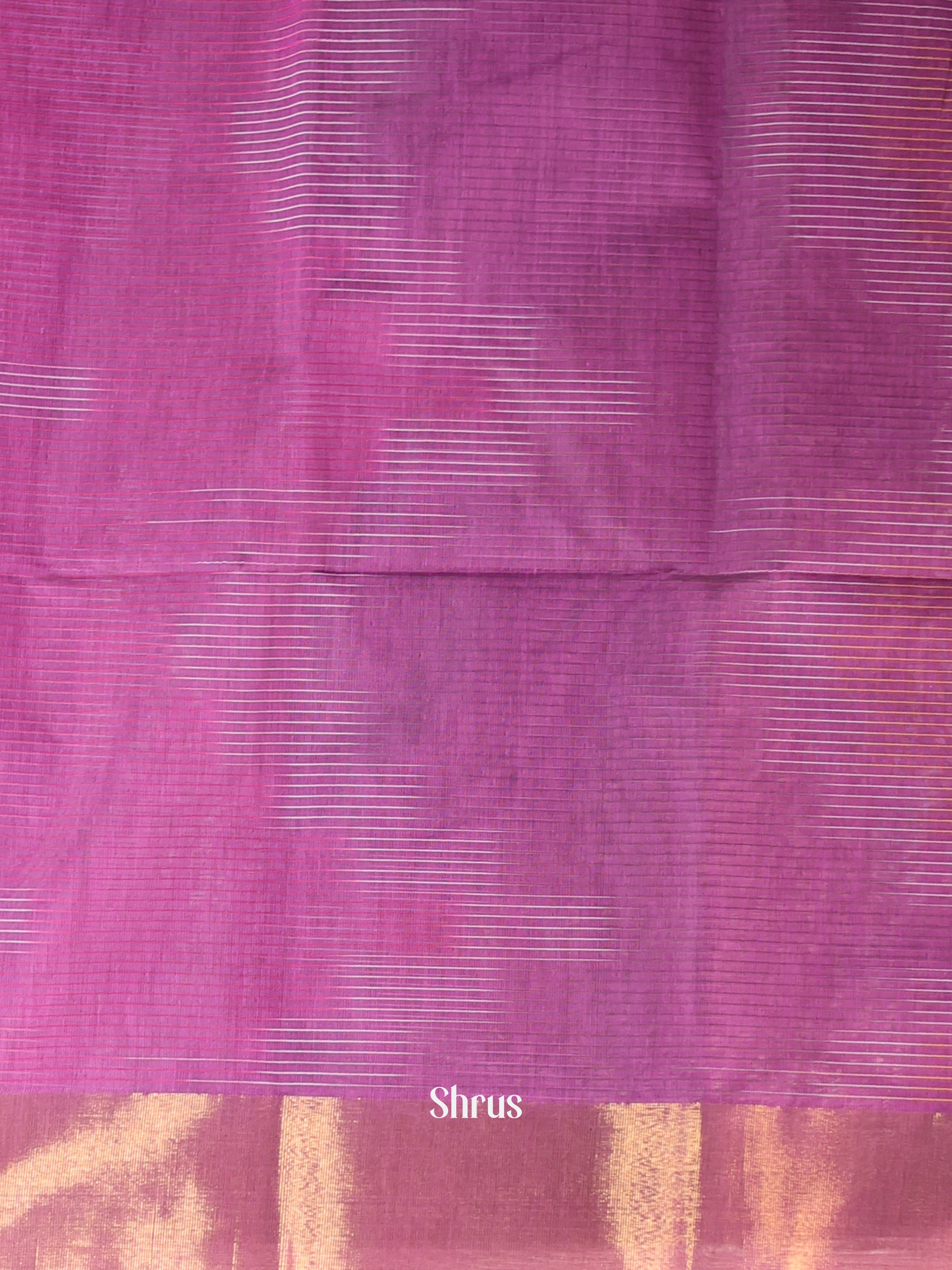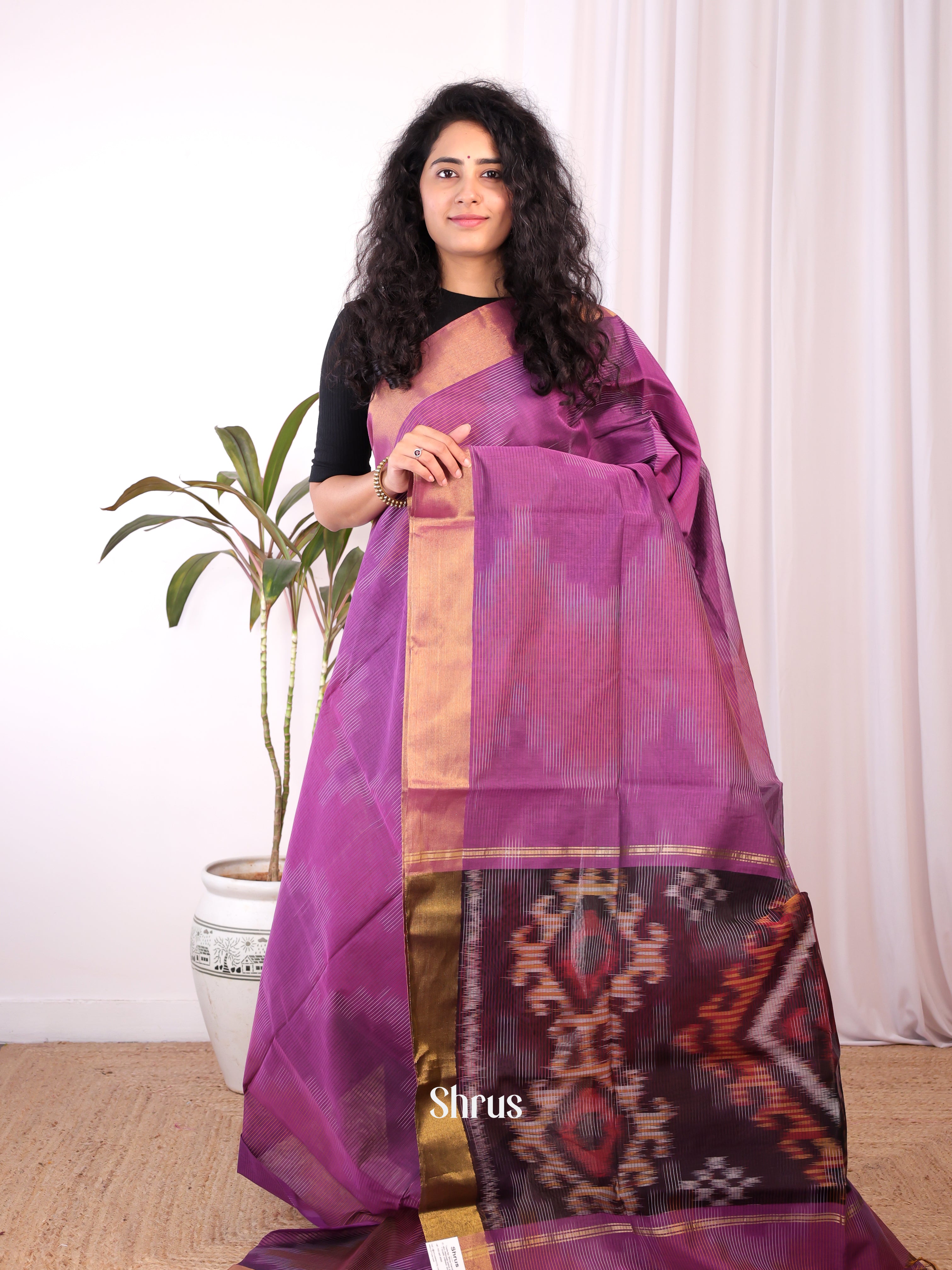 Pretty Purple Ikkat Kora Cotton saree is crafted with ikkat pattern on the body, bordered with zari for a sophisticated look. The contrast woven ikkat pallu and self blouse with zari border add the perfect finishing touch.