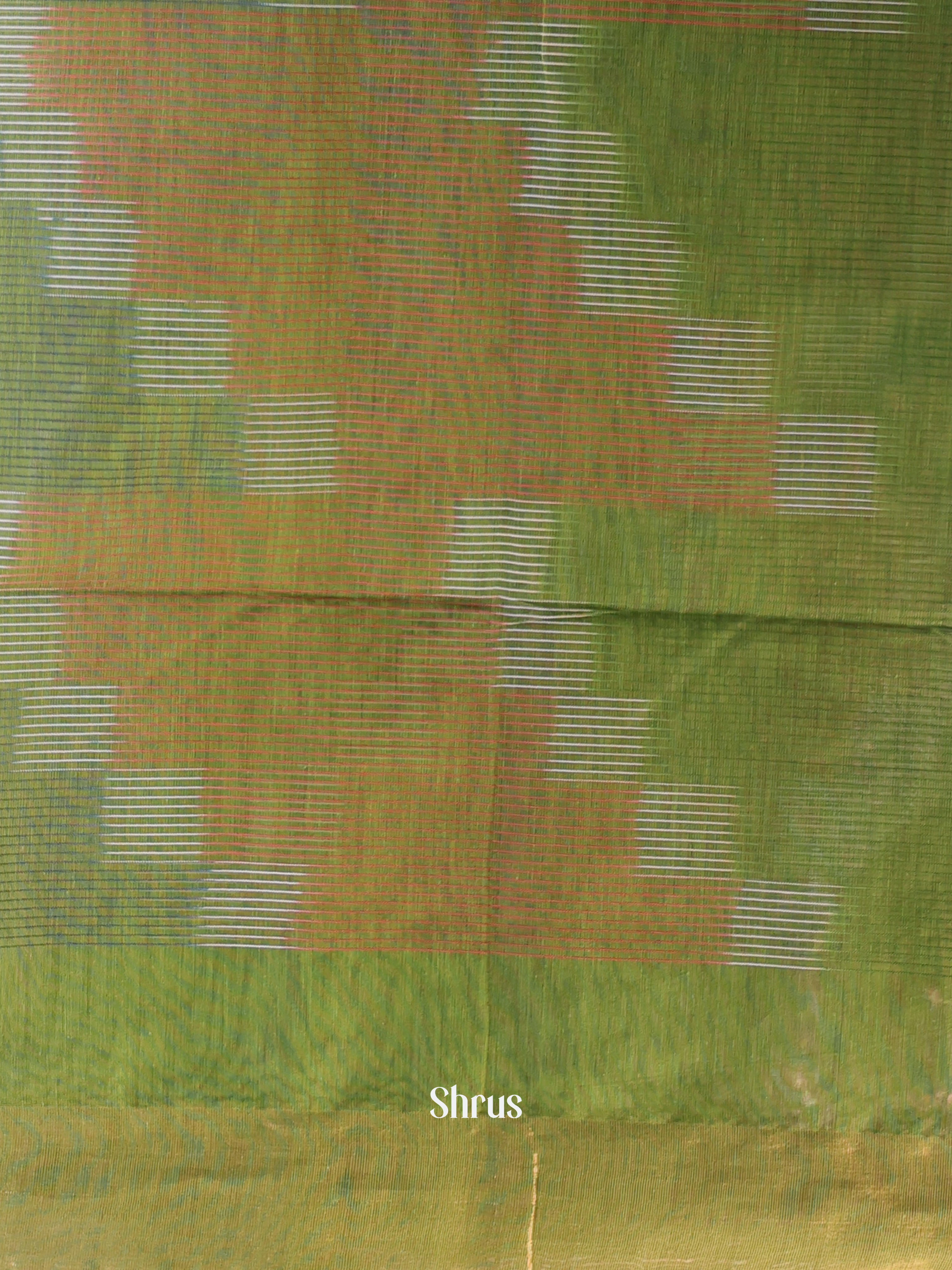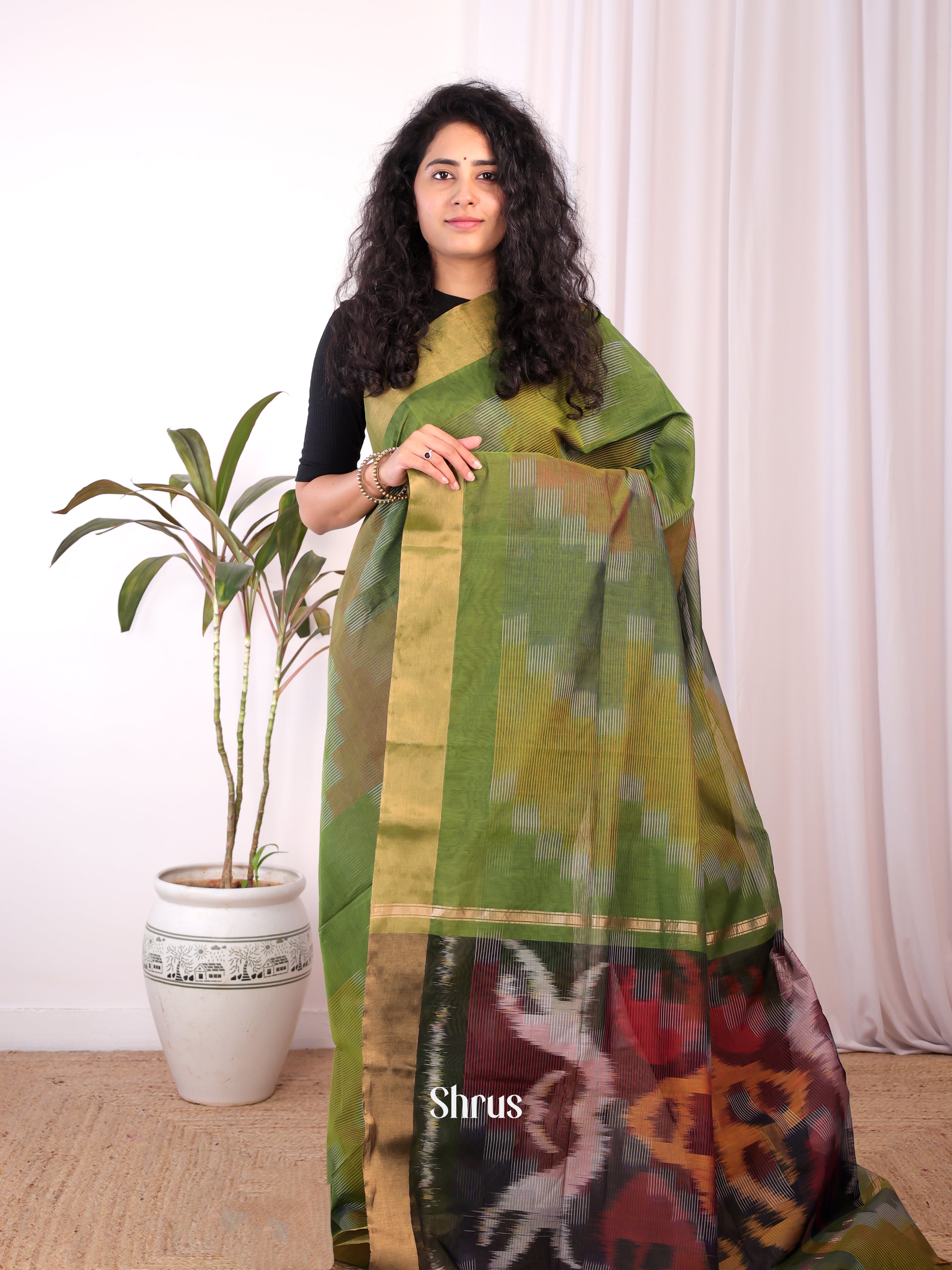Elegant Green Ikkat Kora Cotton saree is crafted with ikkat pattern on the body, bordered with zari for a sophisticated look. The contrast woven ikkat pallu and self blouse with zari border add the perfect finishing touch.
