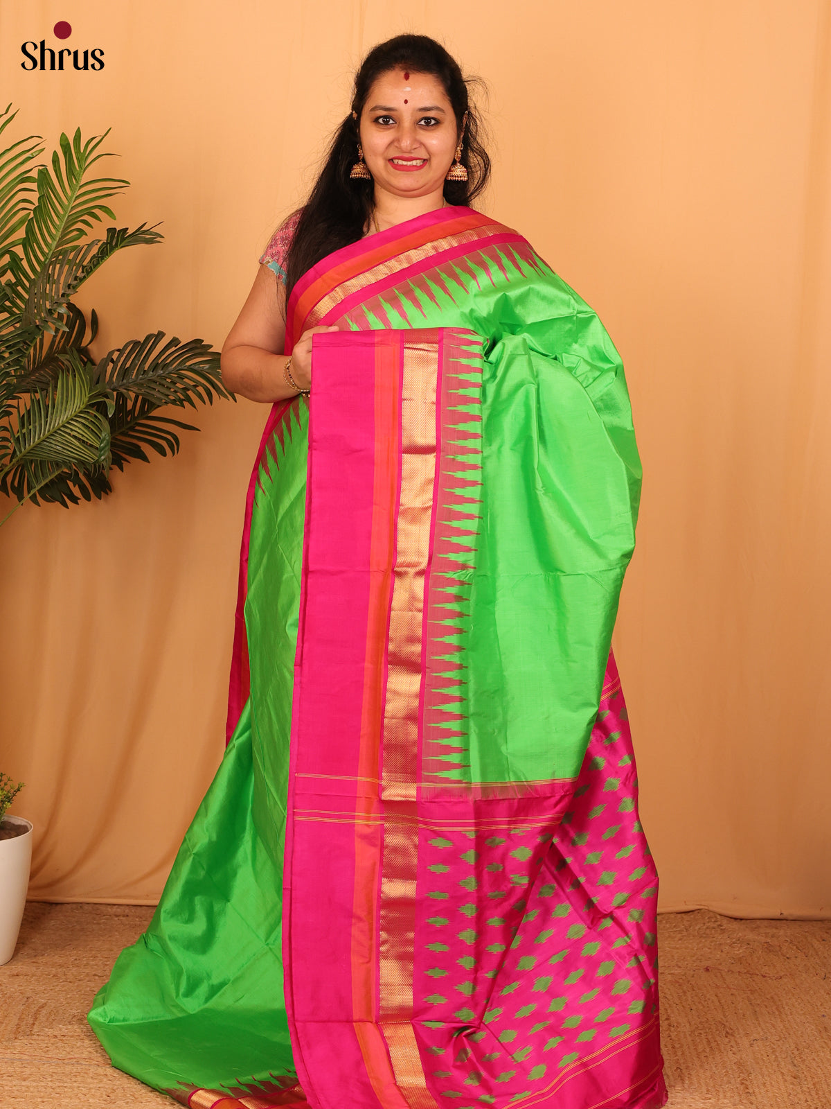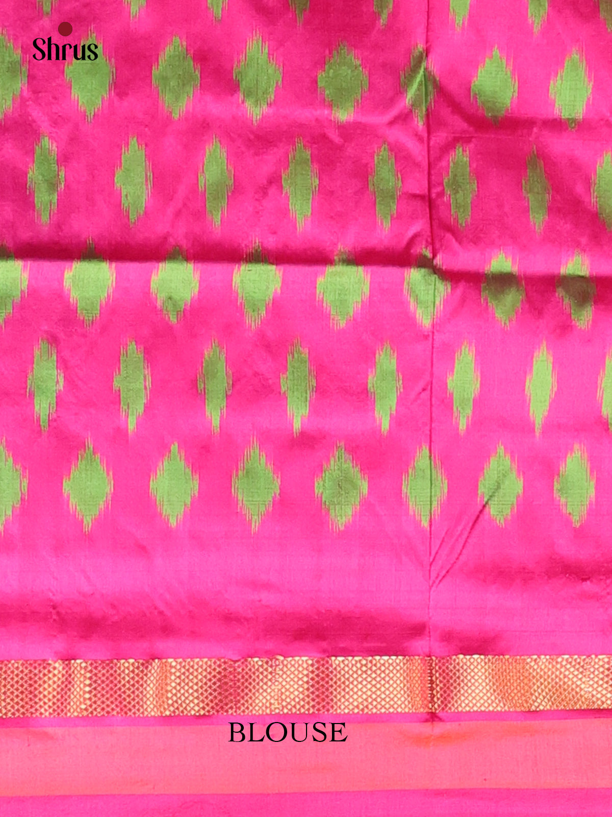 Elegant Green Ikkat Silk Saree enchants with plain body and a striking Pink zari border. The stunning contrast Pink ikkat woven pallu adds to its overall appeal. Additionally, a contrast Pink ikkat blouse with a zari border is included to complete the look. The ikkat saree cost reflects the artistry and heritage woven into every thread.