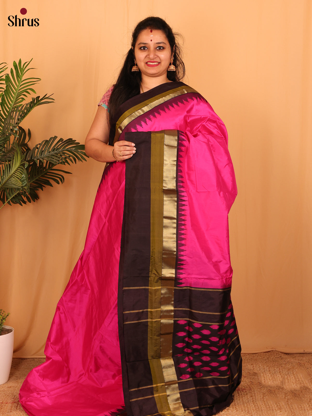 Beautiful Pink Ikkat Silk Saree boasts a simple body and striking Black zari border. The gorgeous Black ikkat woven pallu only heightens its beauty. To complete the look, it comes with a complementary ikkat blouse featuring a zari border. Woven with love by our incredible Ikkat sarees weavers, each drape is a masterpiece.