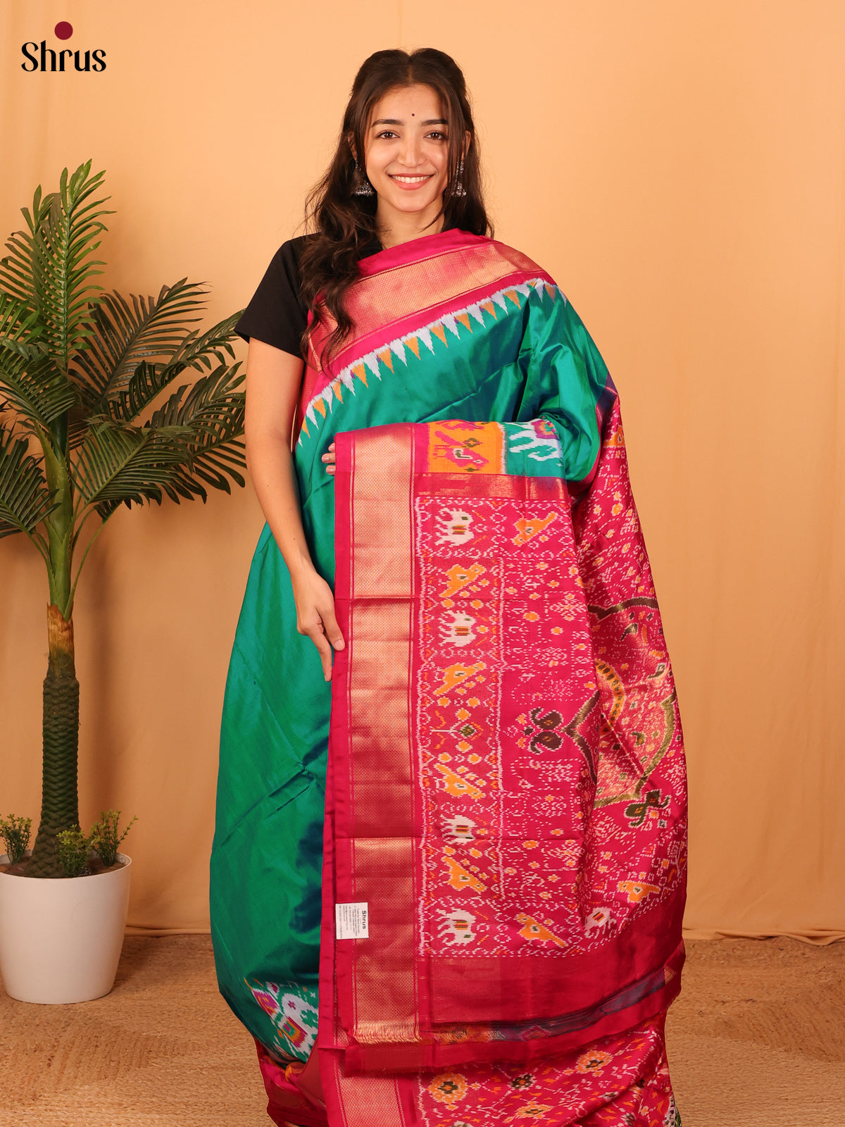 Pretty Green Ikkat Silk Saree enchants with ikkat woven elephant buttas near the border and a striking Red zari border. The stunning contrast ikkat woven pallu adds to its overall appeal. Additionally, a contrast blouse with a zari border is included to complete the look. The Ikkat silk saree price reflects the intricate craftsmanship and rich heritage woven into every thread, offering timeless elegance at a true value.