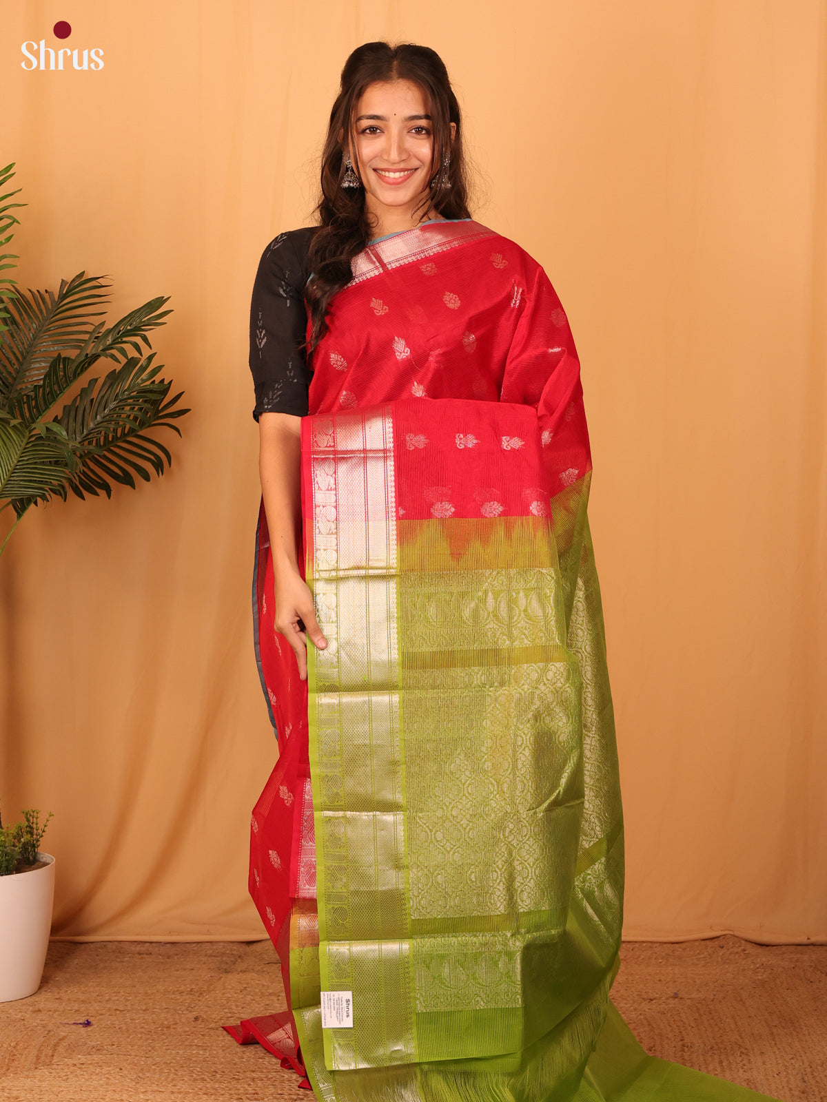 Turn heads with this stunning red Mangalagiri silk cotton saree, beautifully embellished with golden zari buttas and a luxurious green brocade pallu. The subtle self-zari border enhances its elegance, while the matching plain blouse with zari detail completes the ensemble.