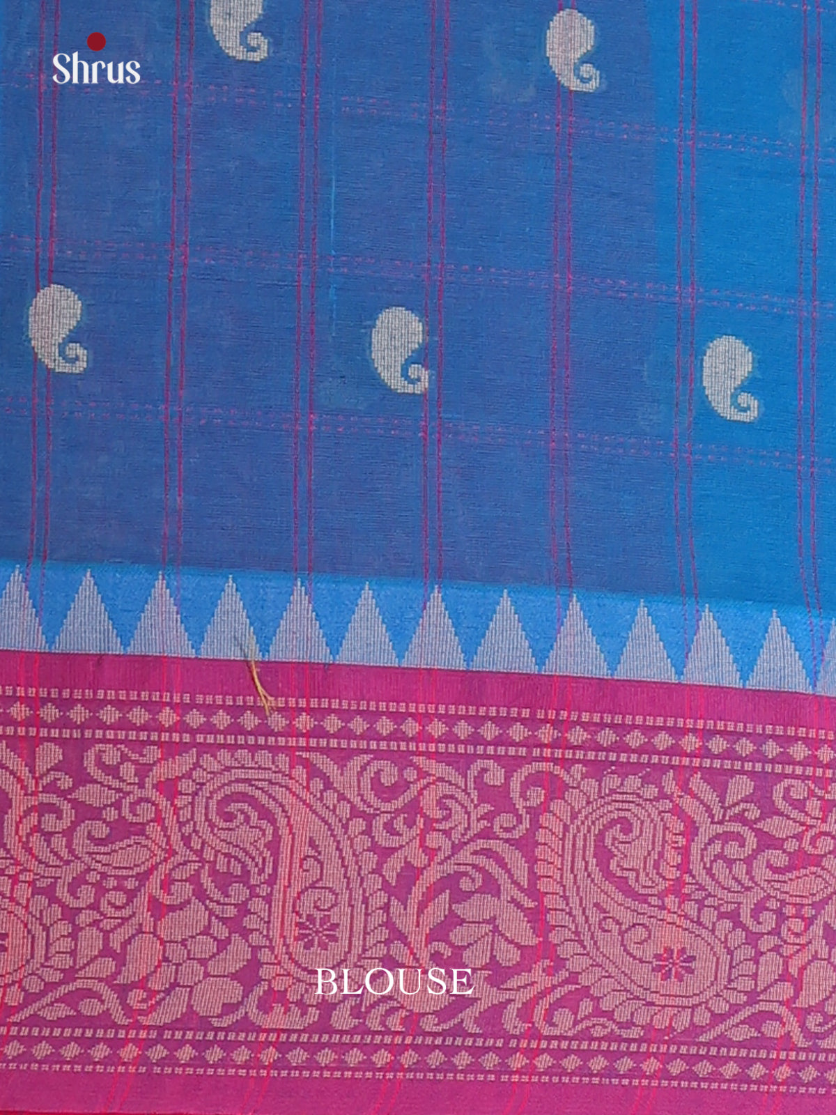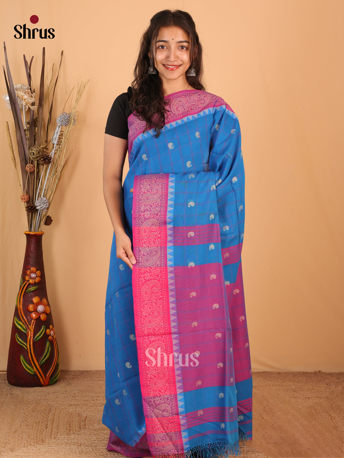 Beautiful Blue Bengal cotton Saree features thread woven checks, buttas on the body . The elegant contrast Purple woven floral vines border & pallu is paired with a simplistic, contrast Blouse with border.