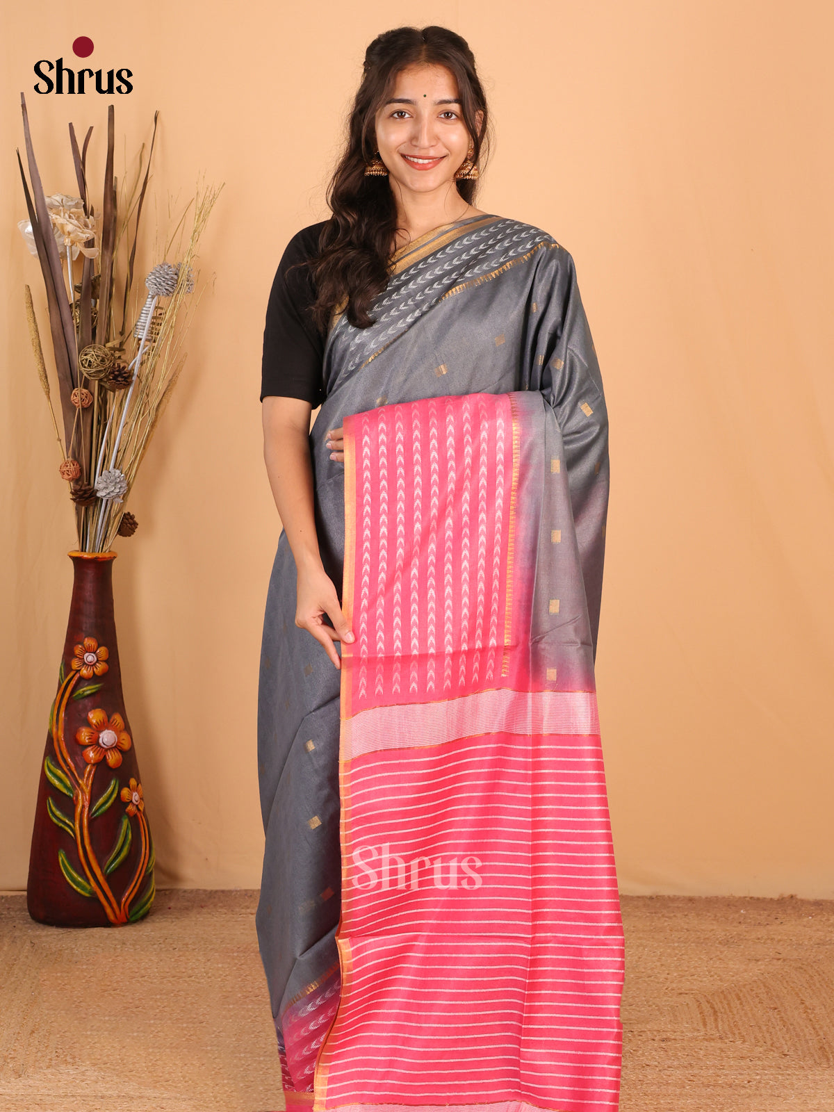 Grey & Pink - Semi Tussar Saree