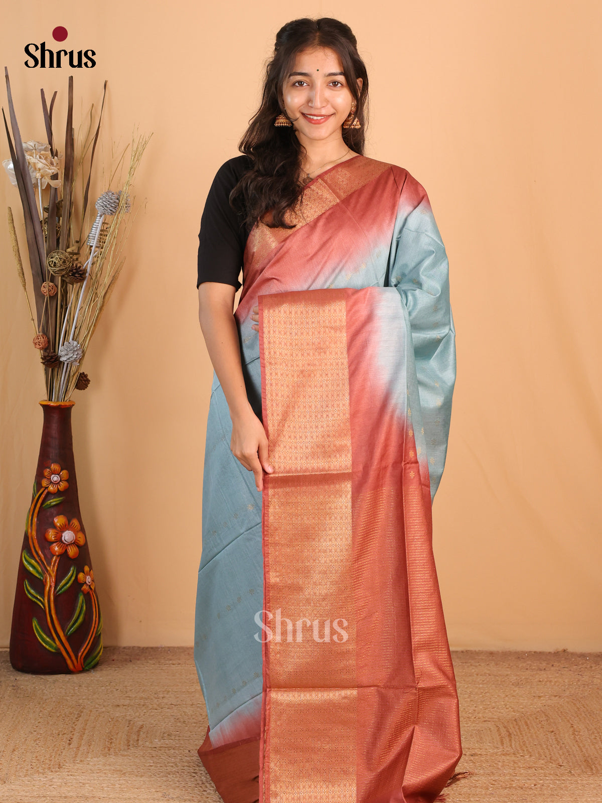 Pretty Grey Semi Tussar saree features a beautiful zari buttas on its body and is enhanced with a contrast Brown zari woven border. The Brown zari Pallu adds to its charm and is accompanied by a contrast Plain blouse with zari border completing the ensemble.